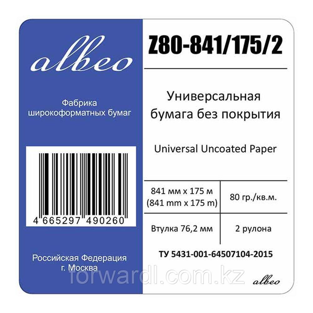 ALBEO Z80-841/175/245 886Купить!тг. Маркетплейс: Satu.kz ТОО "Forward L" Доставка: по Казахстану ПожаловатьсяALBEO Z80-841/175/2 Бумага инженерная 80г/м2, 0.841х175м, втулка 76мм, 2 рулона , Universal Uncoated Paper (2 rolls)