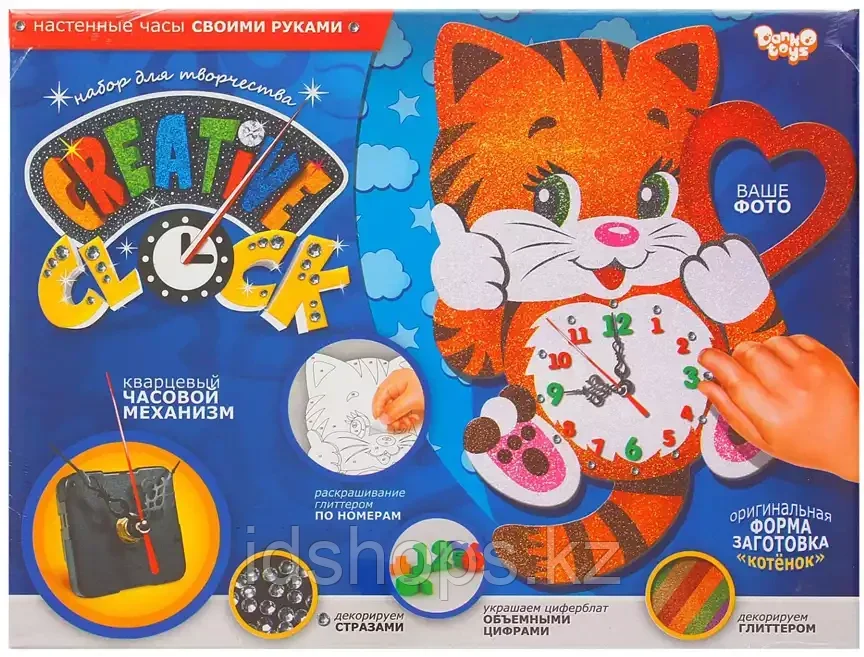 Набор для творчества Часы Creative clock СС-01-01 Котенок4 095Купить!тг. Маркетплейс: Satu.kz ID Shopps.kz - Оптово-розничный Склад Доставка: по Казахстану ПожаловатьсяНабор для творчества Часы своими руками откроет Вашим детям прекрасный мир созидания различных предметов повседневного обихода. Эти часы можно будет потом повесить в детской, а ребенок будет рад и гор еще→д за то, что смог сделать первые шаги по самостоятельному преображению интерьера у себя в комнате. Кроме того, во время работы над часами детки смогут развивать свои творческие