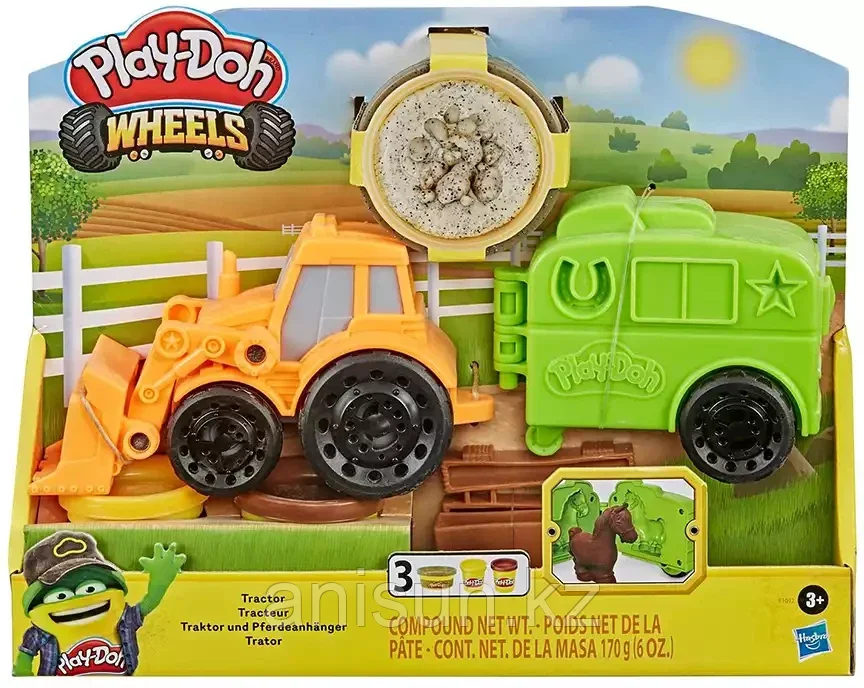 Игровой набор Play-Doh F10125L0 Фермерский трактор8 965Купить!тг. Маркетплейс: Satu.kz Ani-Sun Trade Доставка: по Казахстану ПожаловатьсяЗапрягай свою лошадь и тащи тюки сена! Линейка Play-Doh Wheels преремещается на ферму с трактором и прицепом . Лепите лошадей с помощь формы-штампа внутри прицепа