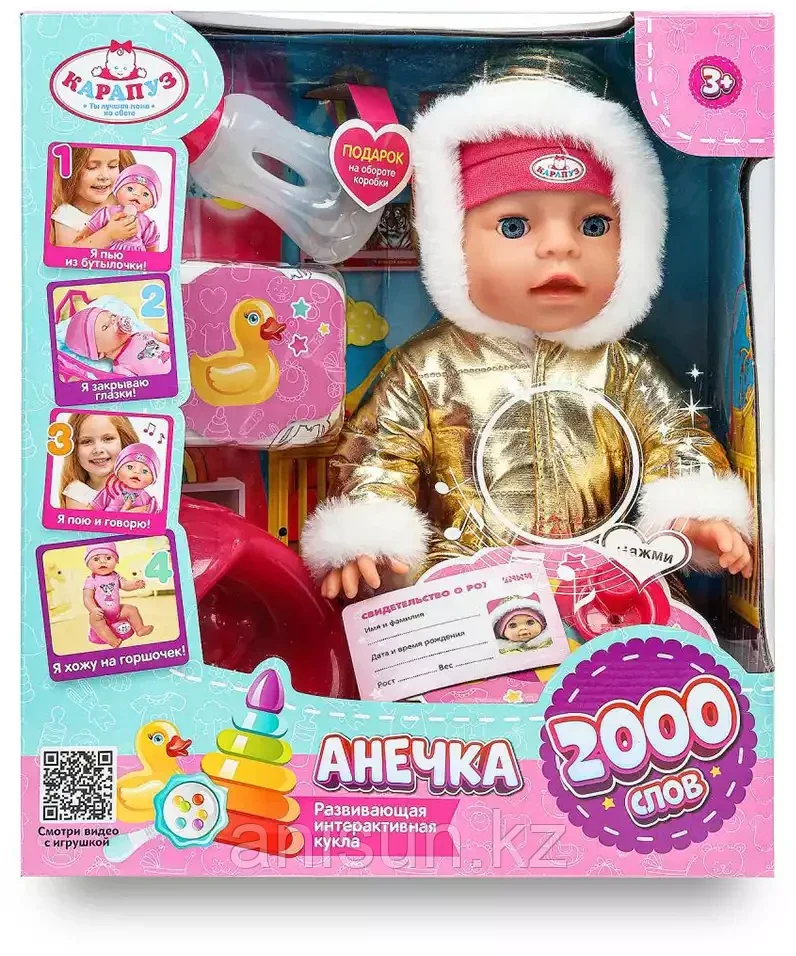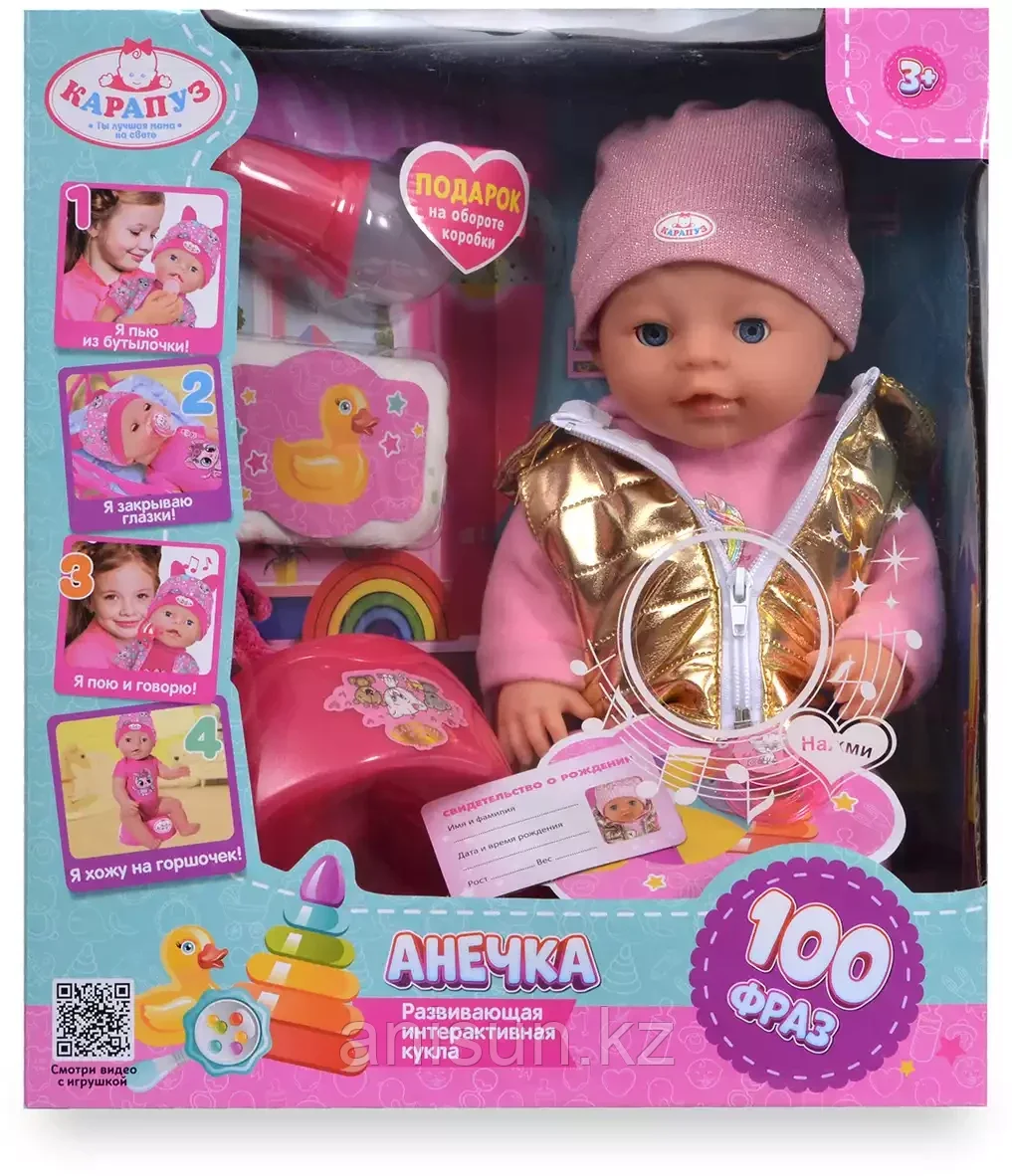 Пупс функциональный Y40BB-CASUAL-24-RU Анечка с аксессуарами Карапуз26 486Купить!тг. Маркетплейс: Satu.kz Ani-Sun Trade Доставка: по Казахстану ПожаловатьсяИнтерактивный пупс «Анечка» ТМ «Карапуз» станет замечательным подарком для вашей принцессы. Милый пупс Анечка с детально проработанным личиком обязательно понравится вашей малышке. Кукла одета в милый еще→костюмчик розовой расцветки с принтом, золотистую жилетку и розовую шапочку. Одежда легко надевается и снимается. С такой куколкой девочка может играть в самые разные игры,