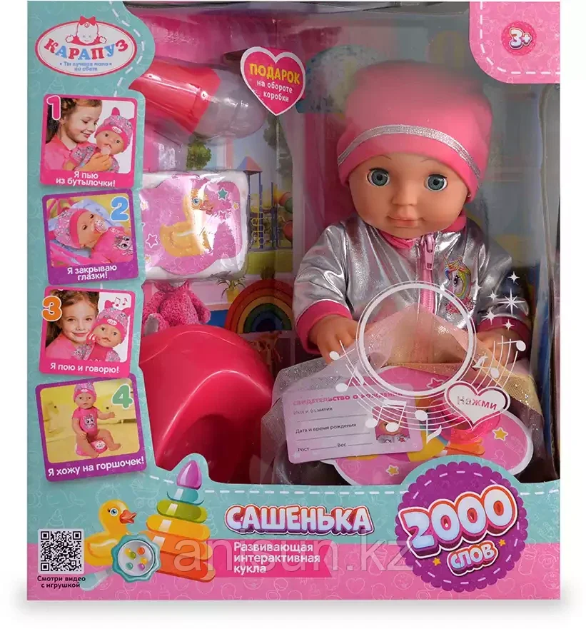 Пупс функциональный Y30BB-DP-BOOBA-PB-RU Сашенька Карапуз24 242Купить!тг. Маркетплейс: Satu.kz Ani-Sun Trade Доставка: по Казахстану ПожаловатьсяИнтерактивный пупс «Сашенька» ТМ «Карапуз» станет замечательным подарком для вашей принцессы. С его тщательно проработанным личиком и милым нарядом, он обязательно завоюет сердце вашей малышки. Кукла еще→одета в серебристую курточку на молнии с принтом единорога и пышную нарядную юбочку, на голове - ярко-розовая шапочка с серебристой полоской. Одежда легко надевается и снимается.