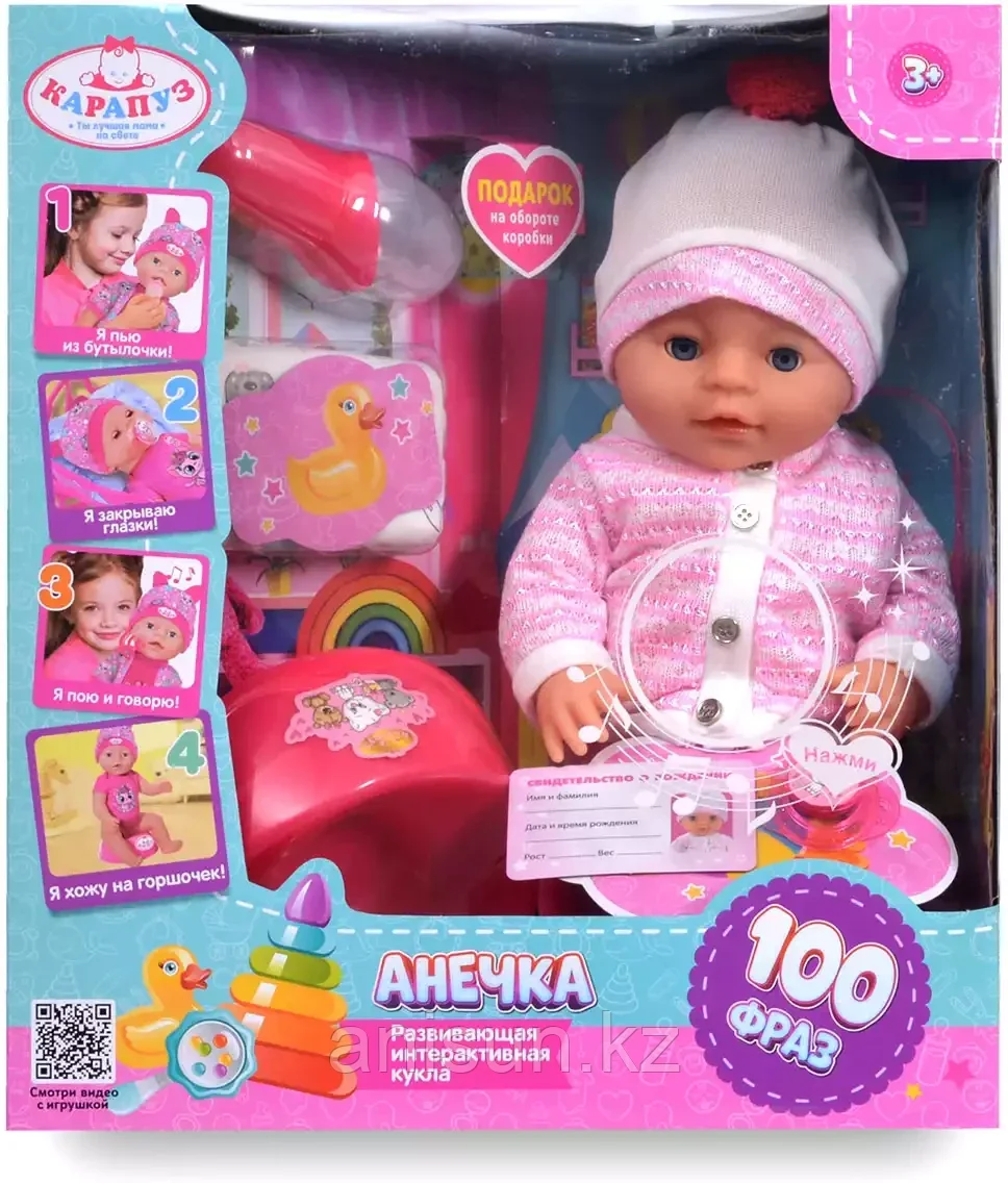Пупс функциональный Y40BB-KNIT-24-RU Анечка с аксессуарами Карапуз26 039Купить!тг. Маркетплейс: Satu.kz Ani-Sun Trade Доставка: по Казахстану ПожаловатьсяОзвученный пупс «Анечка» ТМ «Карапуз» станет прекрасным подарком для девочки. Этот милый пупс обязательно понравится вашей малышке. Анечка одета в тёплый костюмчик в бело-розовой цветовой гамме, на го еще→лове - шапочка в тон с милым помпоном. Одежда легко надевается и снимается. С такой куколкой девочка может играть в самые разные игры, гулять с ней, петь песни, кормить, переодевать,