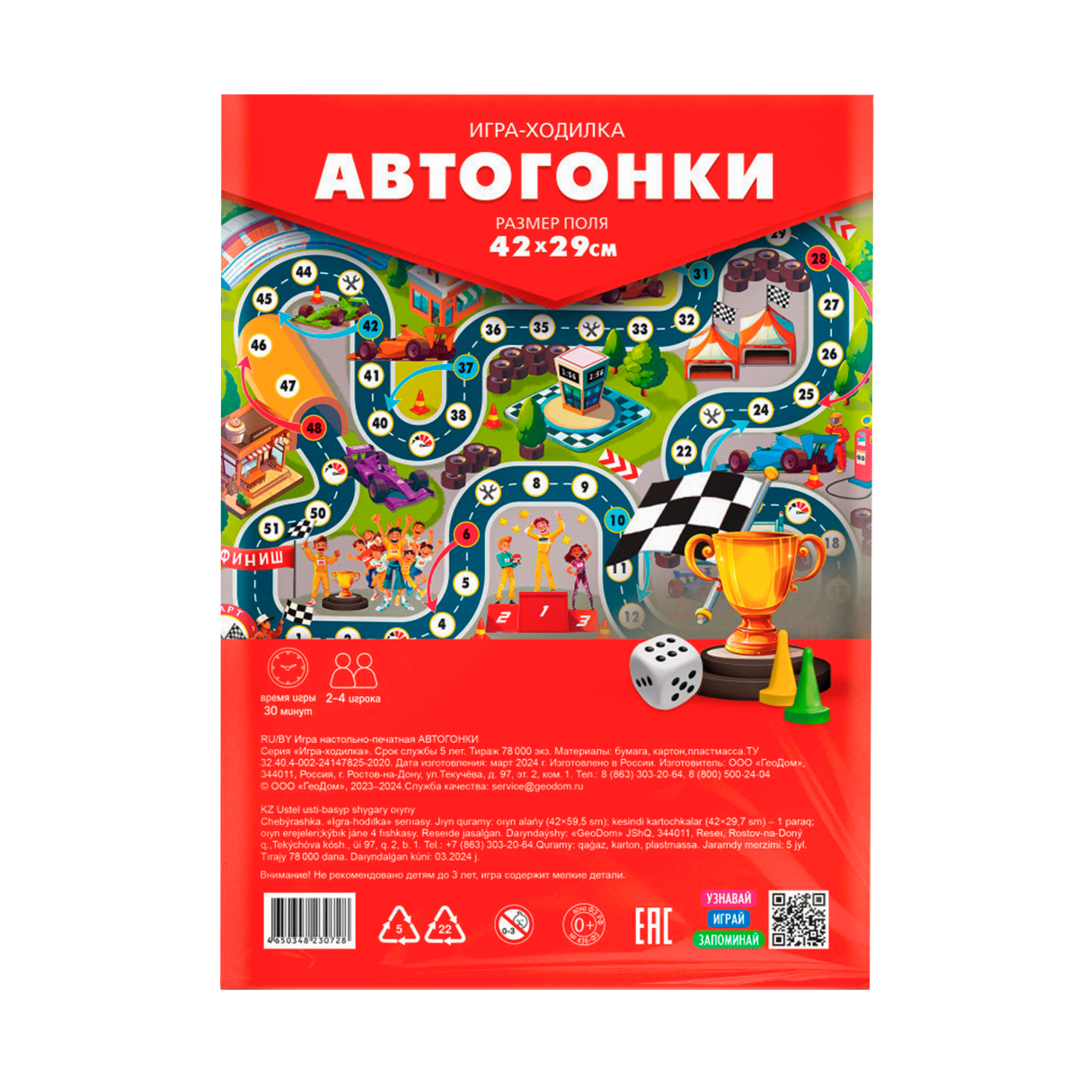 Геодом: Игра-ходилка Автогонки790Купить!тг.Marwin.kzДоставка: из АлматыПожаловатьсяНовая игра-ходилка «Автогонки» – это отличное развлечение для всей семьи! Разложите игровое поле, выберите фишки и участвуйте в захватывающей гонке, преодолевая крутые повороты на пути к победе. К еще→омпактное поле складывается до формата А5, что делает игру удобной для хранения и поездок. «Автогонки» не только дарят весёлое времяпрепровождение, но и помогают тренировать счёт, развивать мелкую моторику, внимание и стратегическое мышление. Отличный выбор для дома и путешествий! В комплекте: игровое пол, кубик и 4 фишки. - Размер игрового поля: 42 х 29.7 см