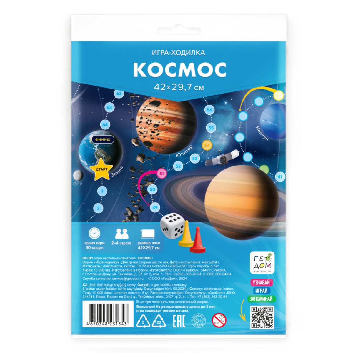 Геодом: Игра-ходилка Космос790Купить!тг.Marwin.kzДоставка: из АлматыПожаловатьсяНовая игра-ходилка «Космос» имеет удобный формат и подойдёт для всей семьи. Разложите поле, выберите фишки и отправляйтесь в увлекательное путешествие по планетам Солнечной системы! Играя, можно узн еще→ать много нового! Компактное поле легко разложить и удобно брать с собой: игра складывается до формата А5. Игра тренирует счёт, развивает мелкую моторику и внимание. В комплекте: игровое поле 42×29,7 см, кубик и 4 фишки. Рекомендованный возраст: 6+ Характеристики - Возраст потребителя: 6+ - Производитель: ГЕОДОМ - Пол: мальчикам/девочкам - Размер: 42×29,7 см - Тематика: Космос