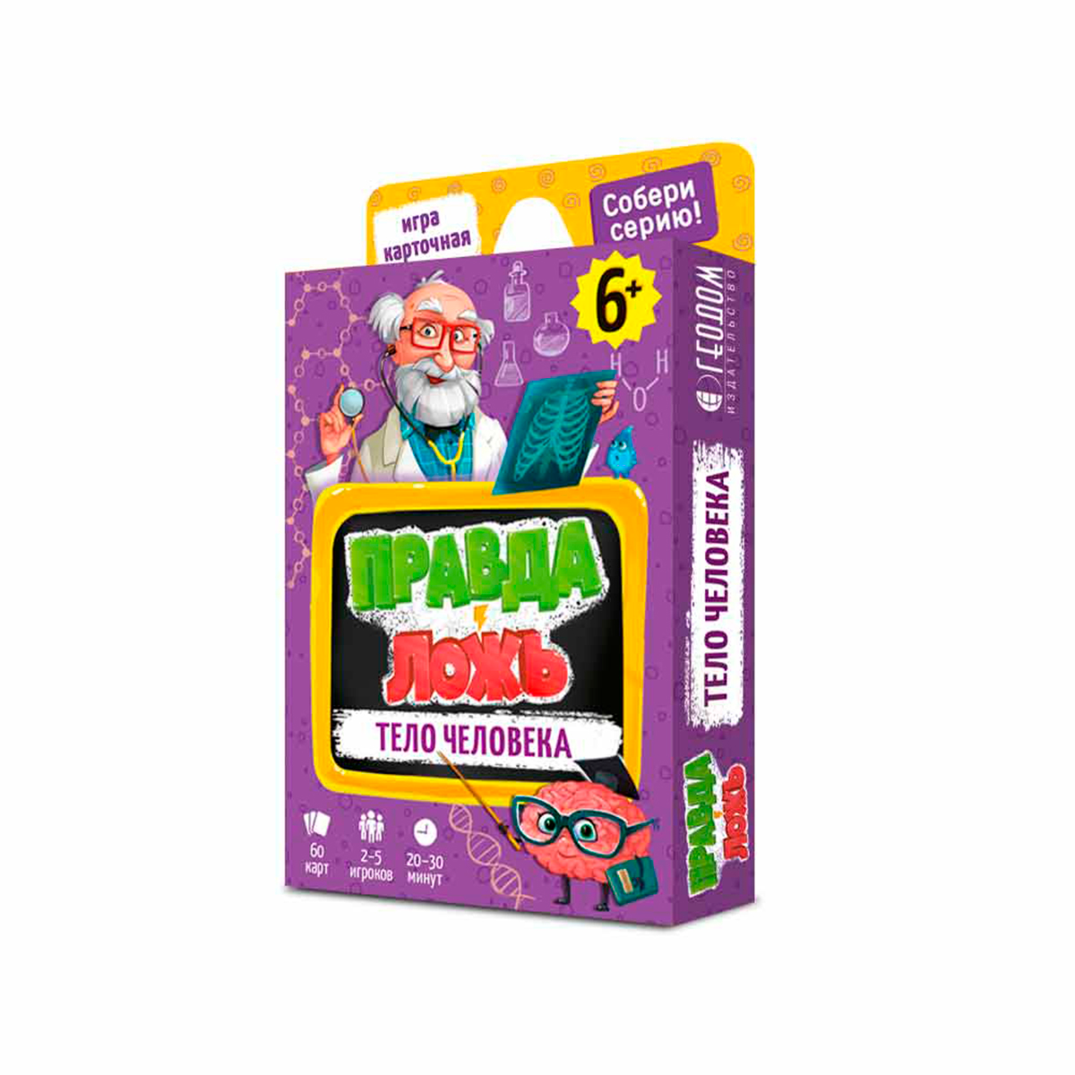 Геодом: Правда-ложь. Тело человека3 990Купить!тг.Marwin.kzДоставка: из АлматыПожаловатьсяНастольная игра «Правда-ложь. Тело человека» от бренда Геодом — увлекательный способ познакомить детей с удивительным устройством человеческого тела. Игра содержит занимательные факты о строении орган еще→изма, анатомии и физиологии, среди которых участникам предстоит разгадать, что правда, а что вымысел. Яркие и красочные иллюстрации на карточках делают игру ещё более наглядной и увлекательной для детей. Игра помогает развивать логическое и стратегическое мышление, коммуникативные навыки, а также способствует формированию умения работать в команде и принимать совместные решения. Компактный размер упаковки делает игру удобной для транспортировки и хранения. Комплектация: 50 карточек с фактами; 10 …