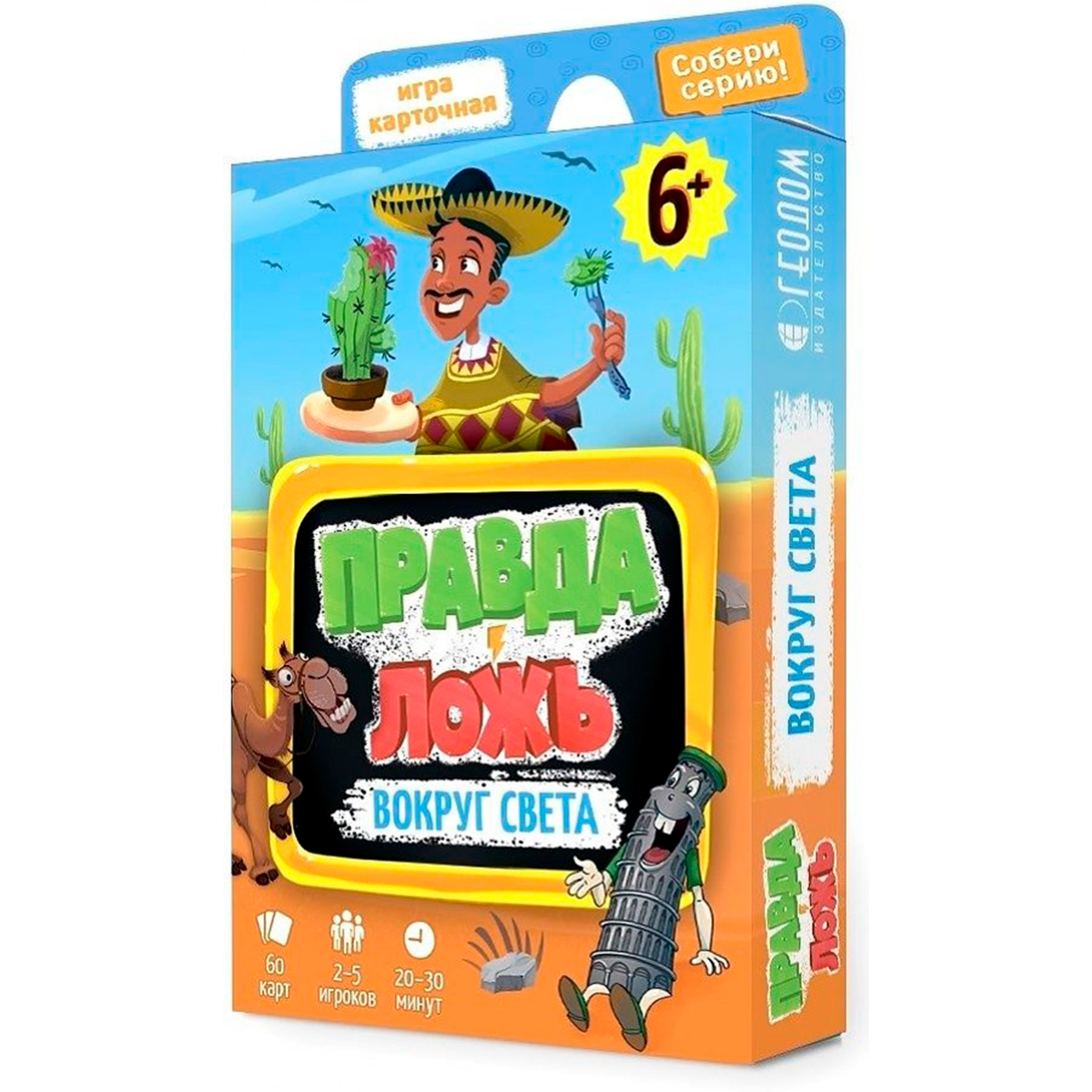 Геодом: Правда-ложь. Вокруг света3 990Купить!тг.Marwin.kzДоставка: из АлматыПожаловатьсяНастольная игра «Правда-ложь. Вокруг света» от бренда Геодом — это увлекательный способ расширить кругозор ребёнка и всей семьи, погружаясь в удивительные факты о странах, традициях и жителях со всего еще→мира. Красочные карточки с вопросами и ответами сделают обучение живым и интересным, а игровой формат способствует лучшему запоминанию информации. Игрокам предстоит определить, какие из приведённых утверждений — правда, а какие — вымысел. Такая игра отлично подойдёт для домашнего досуга, занятий в школе или в дороге, развивая внимание, логику и эрудицию. Оформление карточек выполнено в ярком стиле с иллюстрациями, которые помогают визуально воспринимать информацию. Комплектация: 50 карточек с фактами, …