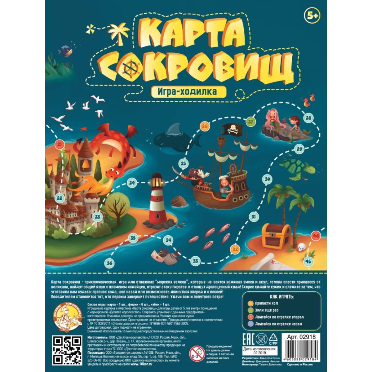 Десятое Королевство: Игра-ходилка Карта сокровищ990Купить!тг.Marwin.kzДоставка: из АлматыПожаловаться«Карта Сокровищ» – приключенческая игра для отважных «морских волков», которые не боятся акул, готовы спасти принцессу от великана, найти общий язык с индейцами, отразить атаку пиратов и найти драго еще→ценный клад! Состав игры: - карта (59х45 см) – 1 шт; - фишки разных цветов (высота – 2 см) – 6 шт; - кубик игральный – 1 шт. Игра изготовлена из картона и пластика и предназначена для детей от 5 лет.