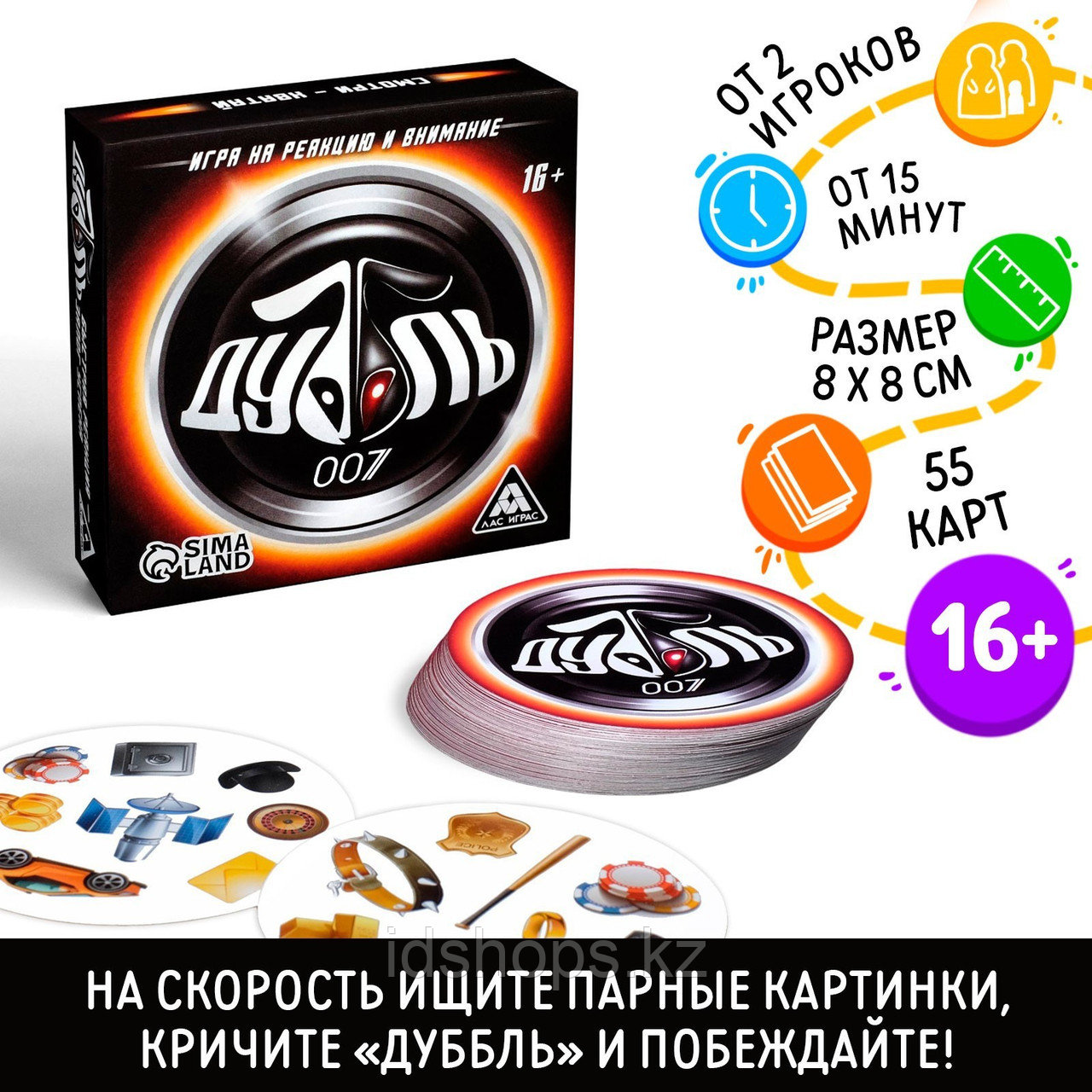 Настольная игра на реакцию и внимание «Дуббль. 007», 55 карт, 16+1 536Купить!тг. Маркетплейс: Satu.kz ID Shopps.kz - Оптово-розничный Склад Доставка: по Казахстану ПожаловатьсяВнимание и быстрая реакция — залог успехаПеред вами невероятная игра на скорость и внимание для настоящих тайных агентов! В ней — карточки с уникальным набором изображений. На каждой паре карт есть об еще→щая картинка, поэтому скорее ищите совпадения и побеждайте!Что нужно делать?На счёт три все участники переворачивают свои карточки и смотрят, какое изображение на их карточках