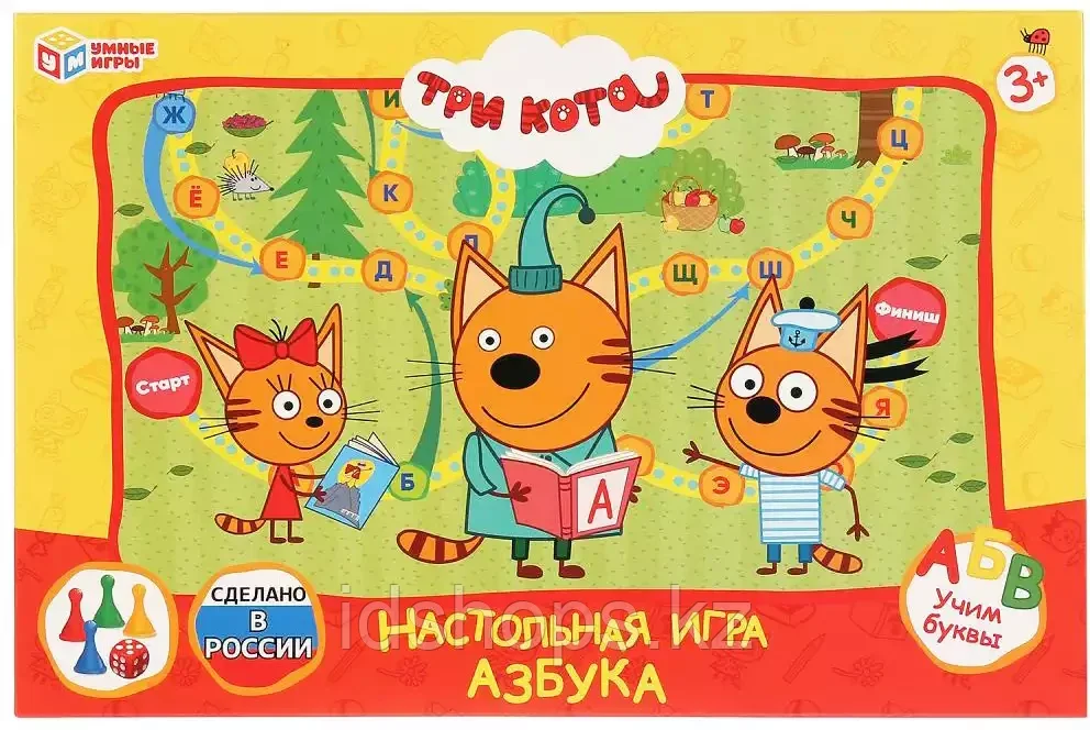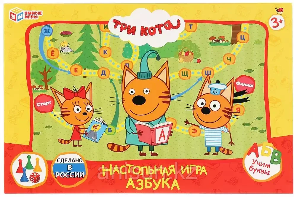 Настольная игра-ходилка АЗБУКА.ТРИ КОТА 272192 Умка1 670Купить!тг. Маркетплейс: Satu.kz Ani-Sun Trade Доставка: по Казахстану ПожаловатьсяНастольная игра-ходилка «Азбука. Три кота» ТМ «Умные игры» основана на одноимённом мультфильме, который так нравится детям весёлой семьёй котиков и интересными сюжетами. В наборе: - игровое поле - куб еще→ик - 4 фишки - правила игры В настольной игре могут участвовать как 1, так и дружная компания из 4 игроков. Участники игрового процесса кидают кубик и ходят вперёд на выпавшее количество