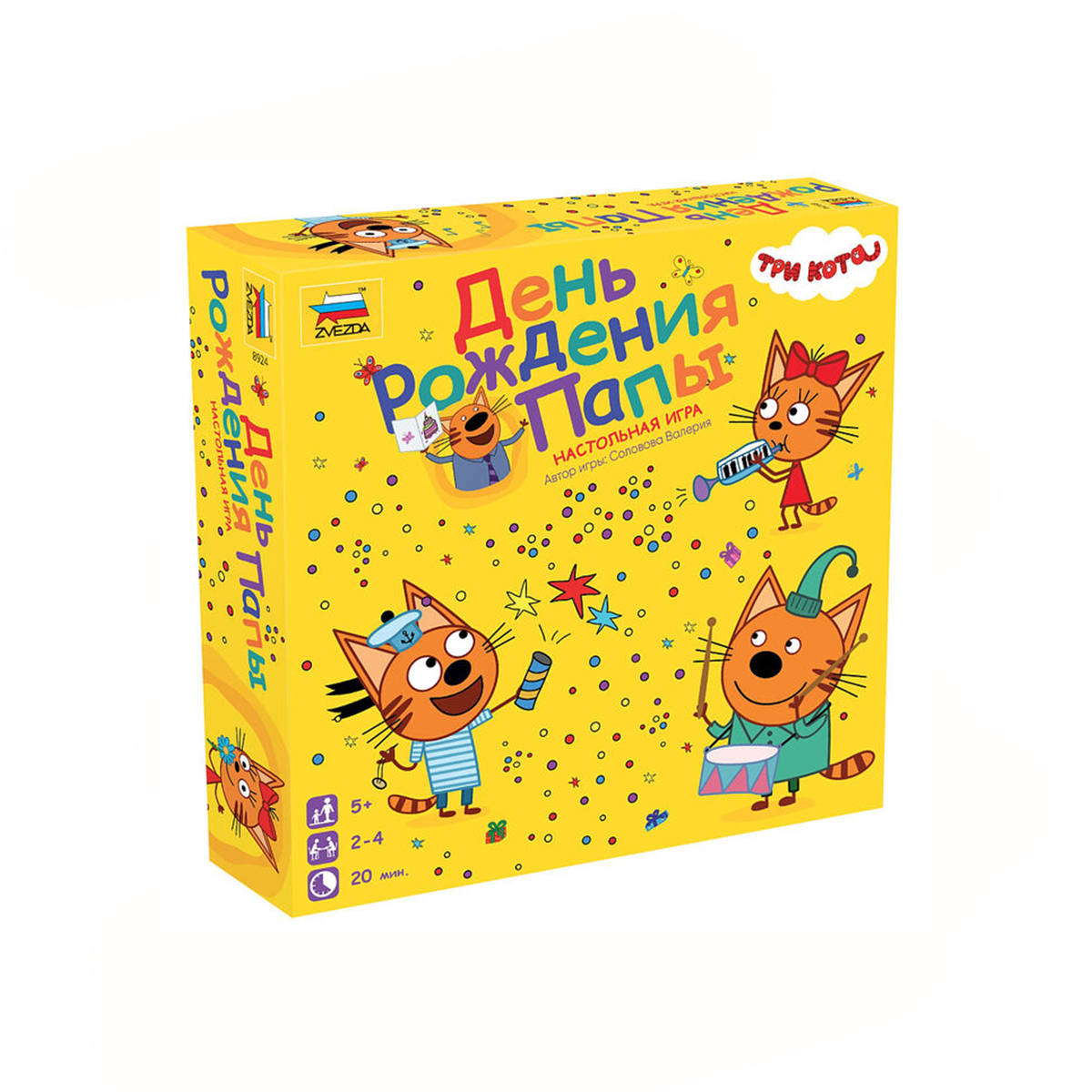 Звезда: Три кота. День Рождения Папы17 590Купить!тг.Marwin.kzДоставка: из АлматыПожаловатьсяПодготовить для Папы веселый день рождения — дело очень непростое! Но Коржик, Компот, Карамелька и Сажик уверены в успехе! До вечера им нужно придумать концертный номер и найти подходящий реквизит. еще→С любыми трудностями котятам поможет справиться Мама, которая сейчас готовит вкусный торт к празднику. Пора действовать! Вперёд! Игроки в роли котят будут передвигаться по игровому полю с помощью бросков кубика и собирать реквизит — цветные жетоны предметов. Как только игрок соберет три жетона предметов разных цветов, он может приступать к подготовке концертного номера. Отрепетировав номер в секторе подготовки, игрок получает карточку концертного номера. Задача игрока собрать 5 таких карточек и зарабо…