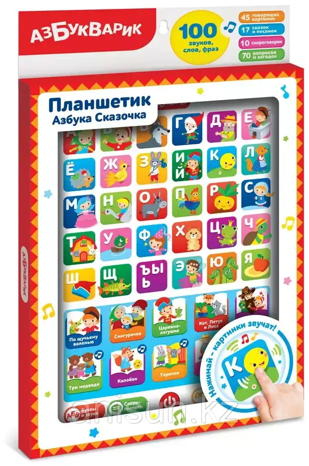 Планшетик Азбука- Сказочка 4680019286167 Азбукварик5 571Купить!тг. Маркетплейс: Satu.kz Ani-Sun Trade Доставка: по Казахстану ПожаловатьсяС новым планшетиком «Азбука Сказочка» можно и учиться, и веселиться! Ребенку понравится изучать буквы со сказочными героями: А – Аленушка, В – Волк, Е – Емеля, всё просто! Учить буквы можно в двух реж еще→имах: «Буквы» и «Звуки». 70 вопросов и загадок в трех играх помогут проверить знания, а 10 скороговорок – улучшить произношение звуков. А после занятий так приятно послушать 10 сказок («По