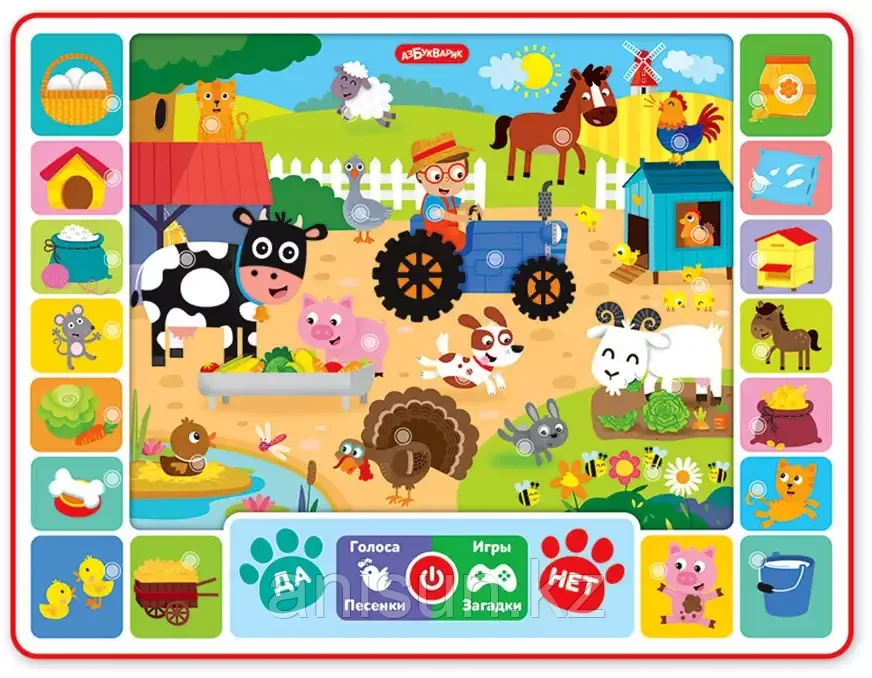 Планшетик Играем на ферме 4630027293480 Азбукварик3 926Купить!тг. Маркетплейс: Satu.kz ID Shopps.kz - Оптово-розничный Склад Доставка: по Казахстану Пожаловаться«Играем на ферме» – это не просто обучающий говорящий планшетик, это настоящая интерактивная ферма для детей! В нем ребенок найдет 6 игровых режимов, более 100 вопросов и заданий и 30 веселых песенок. еще→Нажимая на картинки, малыш познакомится с животными фермы, их детенышами, домиками, послушает веселые звуки и голоса. В режиме «Песенки» можно послушать песенки про всех зверят, а также