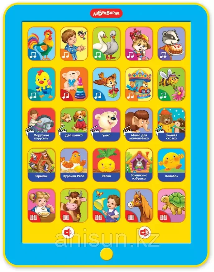 Планшетик Сказочка для маленьких 4630014080680/4680019282541 Азбукварик4 069Купить!тг. Маркетплейс: Satu.kz ID Shopps.kz - Оптово-розничный Склад Доставка: по Казахстану ПожаловатьсяБестселлер Азбукварика – обучающий планшет «Сказочка для самых маленьких» – станет отличным вложением для всестороннего развития ребёнка. В нем собраны любимые потешки, веселые детские песенки, русски еще→е народные сказки, стихи о ребятах и зверятах, добрые мультики. Нажимая на яркие картинки, малыш сможет послушать любимые народные сказки («Теремок», «Курочка Ряба», «Репка»,