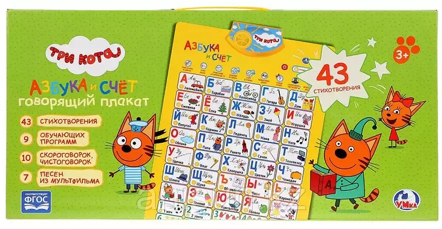 Говорящий плакат азбука и счет Три Кота в стихах HX0251-R25 ТМ Умка6 084Купить!тг. Маркетплейс: Satu.kz ID Shopps.kz - Оптово-розничный Склад Доставка: по Казахстану ПожаловатьсяДети придут в восторг от такого умного, говорящего плаката!Этот чудесный плакат с любимыми детскими персонажами – украсит детскую и поможет вашему малышу быстро и эффективно выучить алфавит.Кроме того еще→, имея постоянно его перед глазами, учиться ребёнку будет проще – запоминать зрительно буквы, читать слова.Учитесь, играя!В плакате :10 скороговорок7 весёлых песен из мультфильмов9