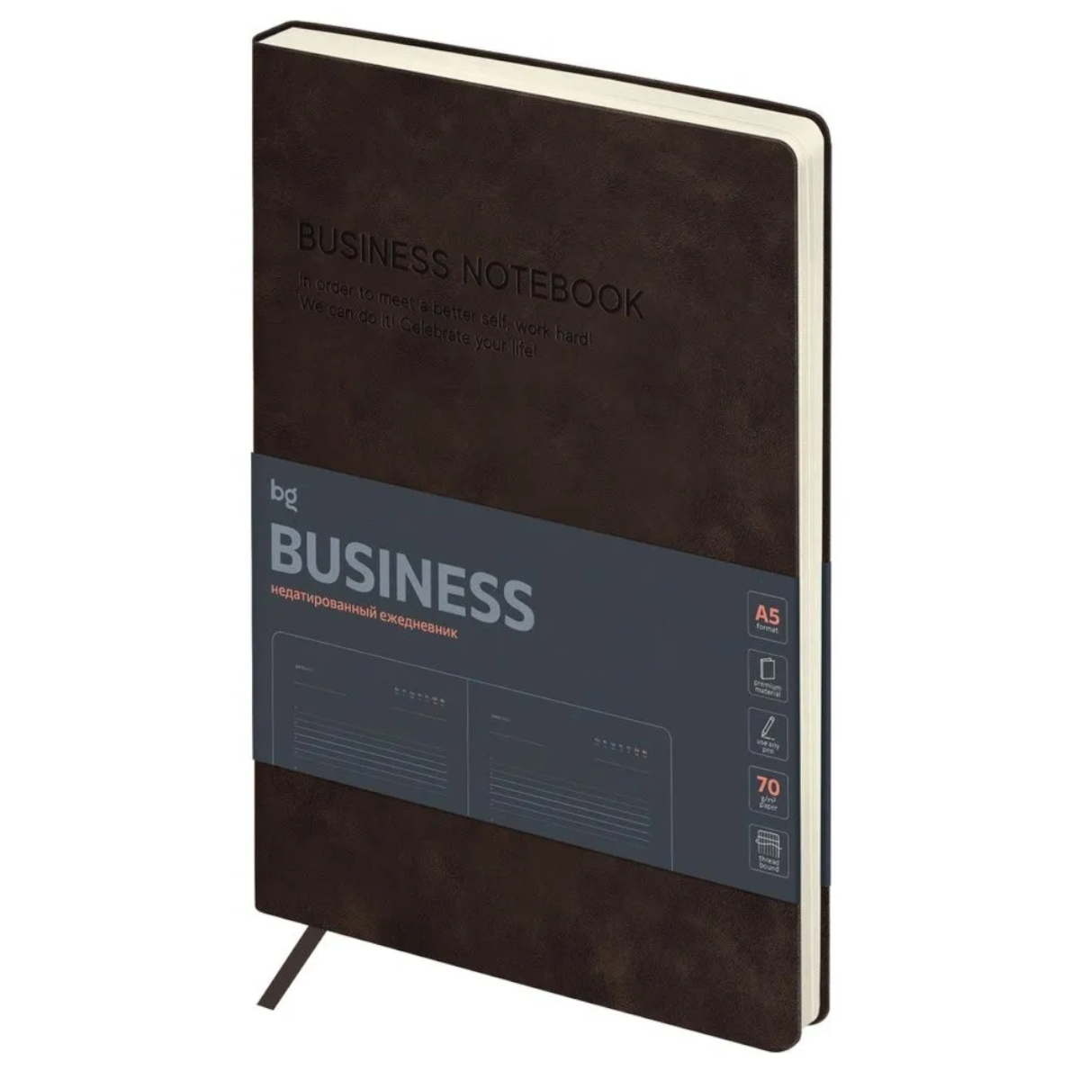 Ежедневник недатированный, А5, 136л., твердый переплет, кожзам, BG "Winner. Brown", коричневый5 350Купить!тг.Marwin.kzДоставка: из АлматыПожаловатьсяЭлегантный недатированный ежедневник BG формата А5 серии «Winner» в твёрдой обложке выполненной из высококачественной экокожи с гладкой матовой поверхностью и поролоновой прослойкой. Внутренний блок еще→состоит из 136 листов офсетной бумаги плотностью 70 г/м² с печатью в 2 краски. Недатированный ежедневник представлен в размере 145 × 205 мм. Перфорированные уголки и закладка-ляссе обеспечат комфорт и удобство при использовании ежедневника. В ежедневнике предусмотрена справочная информация, таблицы, календарь на 4 года и другие полезные сведения. Недатированный ежедневник подходит под персонализацию. Индивидуальная упаковка в термоусадочную пленку. Вид: Ежедневник Тип: Недатированный Формат листов:…