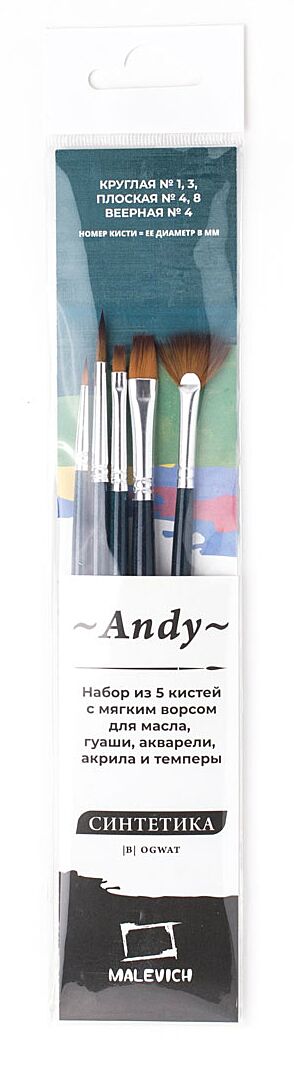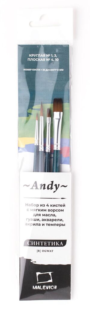 Набор кистей из синтетики Малевичъ "Энди" (5 кистей)3 450Купить!тг.Marwin.kzДоставка: из АлматыПожаловатьсяКисти из синтетики серии Andy это мягкая универсальная синтетика, которая подходит практически для любых видов красок. Ими удобно работать с гуашью, акварелью, акрилом, темперой. Маслом можно работа еще→ть в лессировочной технике с разбавителем. Синтетика рыжего цвета с темным кончиком, ручка покрыта синим лаком, ворс закреплен алюминиевой втулкой с двойной обжимкой. Привлекательный внешний вид и понятная маркировка для удобства покупателя. Ручка кисти короткая - 14 см. Длина ворса (выставка) короткая. Номер кисти соответствует диаметру в мм. В наборе: круглые кисти № 1, 3, плоские № 4, 8, веерная № 4
