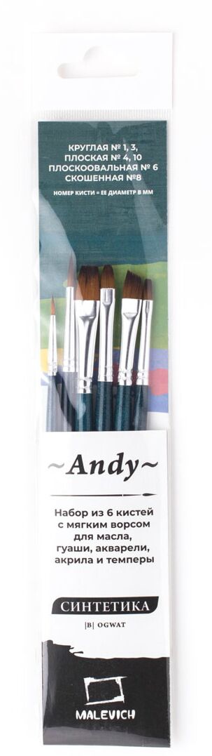 Набор кистей из синтетики Малевичъ "Энди" (6 кистей)4 750Купить!тг.Marwin.kzДоставка: из АлматыПожаловатьсяКисти из синтетики серии Andy это мягкая универсальная синтетика, которая подходит практически для любых видов красок. Ими удобно работать с гуашью, акварелью, акрилом, темперой. Маслом можно работа еще→ть в лессировочной технике с разбавителем. Синтетика рыжего цвета с темным кончиком, ручка покрыта синим лаком, ворс закреплен алюминиевой втулкой с двойной обжимкой. Привлекательный внешний вид и понятная маркировка для удобства покупателя. Ручка кисти короткая - 14 см. Длина ворса (выставка) короткая. Номер кисти соответствует диаметру в мм. В наборе: круглые кисти № 1, 3, плоские № 4, 10, плоскоовальная № 6, скошенная №8