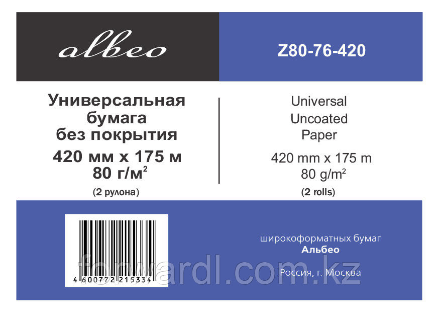 ALBEO Z80-420/175/449 540Купить!тг. Маркетплейс: Satu.kz ТОО "Forward L" Доставка: по Казахстану ПожаловатьсяALBEO Z80-420/175/4 Бумага инженерная 80г/м2, 0.420х175м, втулка 76мм, 4 рулона , Universal Uncoated Paper (4 rolls)