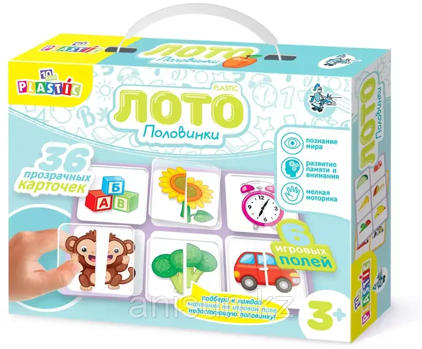 Лото пластик Половинки 04015 Десятое Королевство1 670Купить!тг. Маркетплейс: Satu.kz Ani-Sun Trade Доставка: по Казахстану ПожаловатьсяЛото помогает научиться объединять части в целое. Состав игры: игровые поля (14,5 х 21,5 см) – 6 шт., прозрачные карточки с половинками объектов (6,5 х 6,5 см) – 36 шт. Материалы: картон, пластмасса. еще→Для детей от 3 лет, от 1 до 6 человек. В каждой из 6 ячеек игрового поля изображены различные объекты. Необходимо правильно подобрать прозрачные карточки с половинками этих объектов, чтобы при наложении карточки на ячейку игрового поля картинка становилась целой.