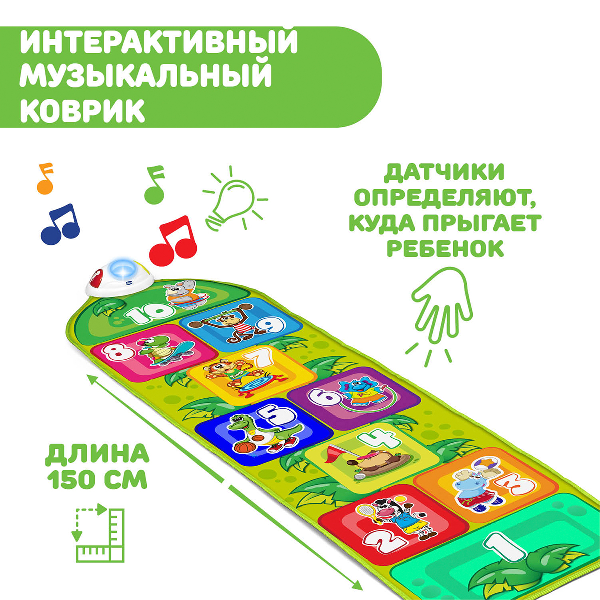 Chicco: Коврик музыкальный "Fit&Fun" Классики 2г+31 490Купить!тг.Marwin.kzДоставка: из АлматыПожаловатьсяИгровой коврик "Jump & Fit" —это современная версия ретро игры "Классики", дополненная световыми и звуковыми эффектами. "Jump & Fit"— это электронный коврик с изображениями 10-ти забавных животных. еще→Прыгая по квадратам, дети смогут насладиться звуковыми и световыми эффектами. 2 режима игры: Игра «классики» Брось монетку и смотри, на какой квадрат нужно прыгнуть. Слушай звуки и мелодии, угадывай животных. Режим «фитнес» Брось мячик и выполни одно из 9-ти упражнений. Игра способствует развитию моторики и ловкости движения. Размеры игрушки (ДхШхВ): 150х40х1 Питание: 3 батарейки типа ААА 1,5V (в комплект не входят)