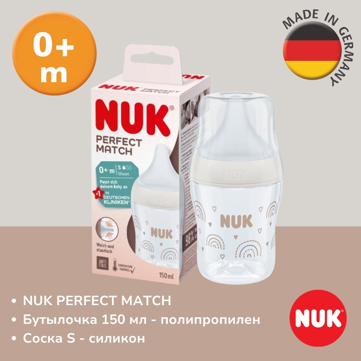 NUK: Бутылка Perfect Match PP сил S 150мл Радуга7 420Купить!тг.Marwin.kzДоставка: из АлматыПожаловатьсяNUK Perfect Match - бутылочка, которая подстраивается под вашего малыша. - Благодаря сверхмягкой и гибкой соске, она повторяет форму материнской груди, нежно прилегает к губам и нёбу ребёнка, созд еще→авая ощущение комфорта и защищённости. - Широкое основание соски ощущается как кожа - 98% малышей принимают такую соску с первого раза. - Естественное кормление: плавная форма соски и широкая зона для губ обеспечивают правильный захват - подтверждено 97% мам. - Спокойный поток: система антиколик и совместимость с тремя размерами сосок (S, M, U) обеспечивают комфортное кормление без лишнего воздуха. - Безопасность: термоиндикатор на бутылочке меняет цвет, если содержимое слишком горячее. - Гигиени…