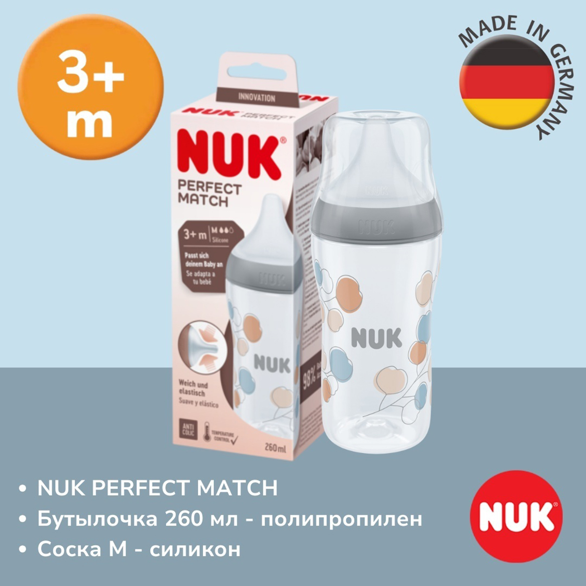 NUK: Бутылка Perfect Match PP сил М 260 мл Ветка10 290Купить!тг.Marwin.kzДоставка: из АлматыПожаловатьсяБутылочка NUK Perfect Match 260 мл, с антиколиковой системой, индикатором температуры, от 3 месяцев, BPA-free. - Мягкая силиконовая соска (размер M, с 3 месяцев) - удобна для малышей с хорошим апп еще→етитом. - Антиколиковый клапан - помогает избежать заглатывания воздуха. - Широкое основание соски - ощущается как кожа и не вызывает дискомфорта. - Плавный поток - способствует спокойному и расслабленному кормлению. - Индикатор температуры - меняет цвет, если содержимое слишком горячее. - Объём 260 мл - оптимален для подрастающих малышей. - Полипропиленовая бутылочка, лёгкая и прочная. - Безопасна - не содержит BPA. - Удобна в использовании и чистке - всего 4 части. - Подходит для всех аксессуар…