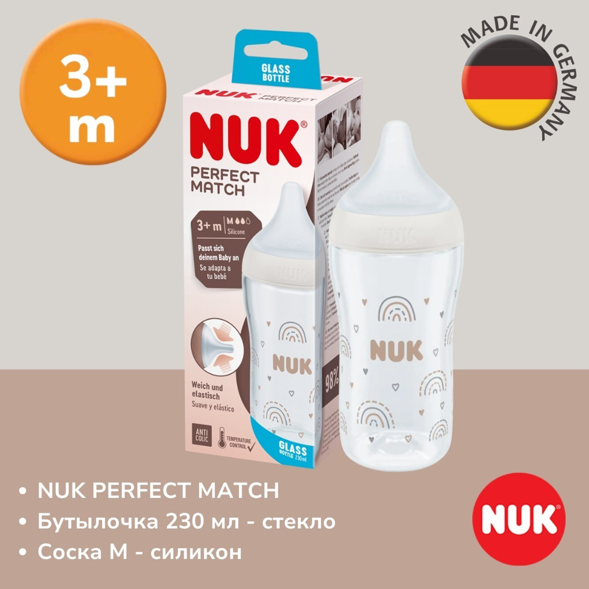 NUK: Бутылка Perfect Match стекло сил M 230 мл Радуга10 990Купить!тг.Marwin.kzДоставка: из АлматыПожаловатьсяДетская бутылочка NUK Perfect Match из стекла, 230 мл, с мягкой силиконовой соской, без BPA. - Мягкая и гибкая соска идеально повторяет форму материнской груди, обеспечивая естественное и комфортн еще→ое кормление. - Подходит для сцеженного грудного молока, смеси, воды или чая. - Ультрамягкая силиконовая соска, принята 98% малышей - Антиколиковая система - для спокойного и плавного питья - Широкое мягкое основание - ощущается как кожа - Индикатор температуры - меняет цвет, если содержимое слишком горячее - Прочное термостойкое стекло, не впитывает запахи - Без BPA, безопасна для здоровья ребенка - Совместима с аксессуарами NUK Perfect Match и Soft&Easy - 230 мл - с соской размера M (с 3 месяцев, для сме…