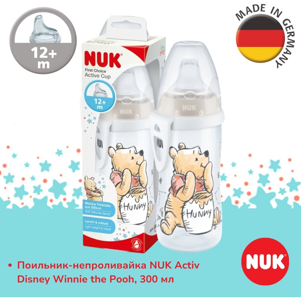 NUK: Поильник 300 мл Activ с 12 + насадка сил Winnie the Pooh, ассортимент7 560Купить!тг.Marwin.kzДоставка: из АлматыПожаловаться- Поильник NUK Activ емкостью 300 мл предназначен для детей от 12 месяцев. - Оснащен непротекающей силиконовой насадкой NUK First Choice. - Идеален для использования как дома, так и вне его. - Изг еще→отовлен из прочного полипропилена (ПП). - Имеет привлекательный и яркий дизайн. - Система NUK Air System предотвращает протекание и обеспечивает комфорт при питье. - Мягкая насадка бережно контактирует с ротовой полостью малыша. - Прозрачный защитный колпачок защищает насадку от загрязнений. - Обеспечивает гигиеничность во время транспортировки. - Сочетает удобство, прочность и функциональность для ежедневного использования. - Тип: поильник-непроливайка - Объем: 300.0 мл - С мерной ш…