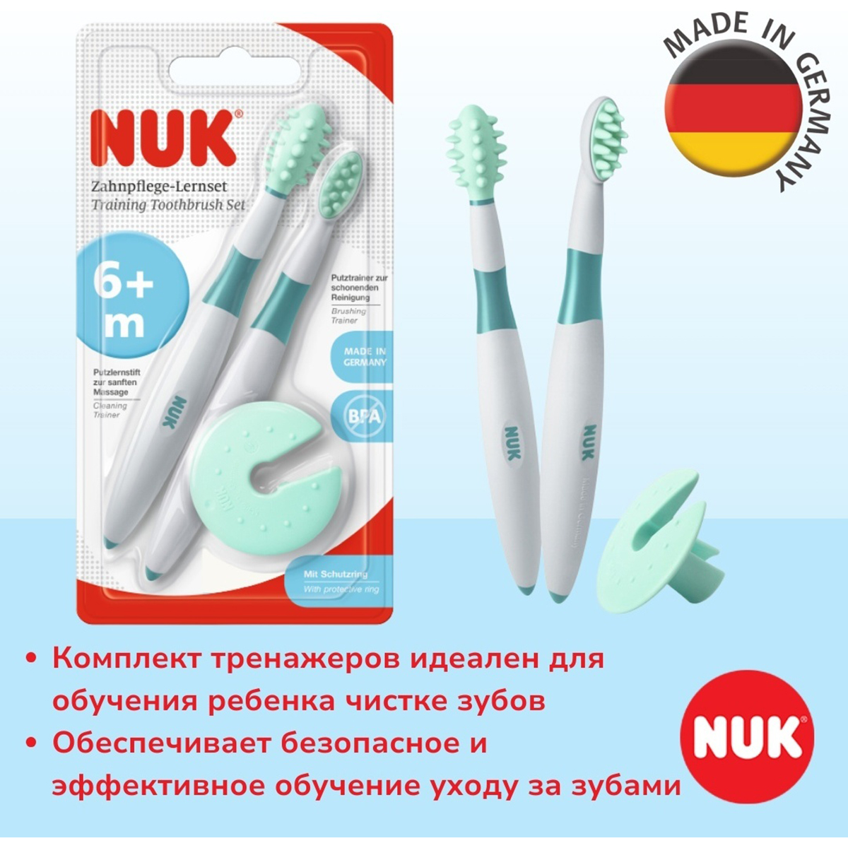 NUK: Тренажер-щеточка для десен 2 шт с ограничителем с 6+ мес5 390Купить!тг.Marwin.kzДоставка: из АлматыПожаловаться- Комплект тренажеров для ухода за полостью рта идеален для обучения ребенка чистке зубов. - Массажер-тренажер бережно массирует десны и уменьшает давление при прорезывании зубов. - Зубная щетка-т еще→ренажер с мягкими шишечками аккуратно очищает первые зубки. - Помогает ребенку развивать навыки ухода за полостью рта с раннего возраста. - Способствует формированию правильных движений при чистке зубов. - Становится важным этапом на пути к самостоятельной гигиене. - В комплект входит защитное кольцо, предотвращающее глубокое проникновение в рот. - Кольцо также используется как подставка для тренажеров. - Комплект обеспечивает безопасное и эффективное обучение уходу за зубами. - Уровень же…