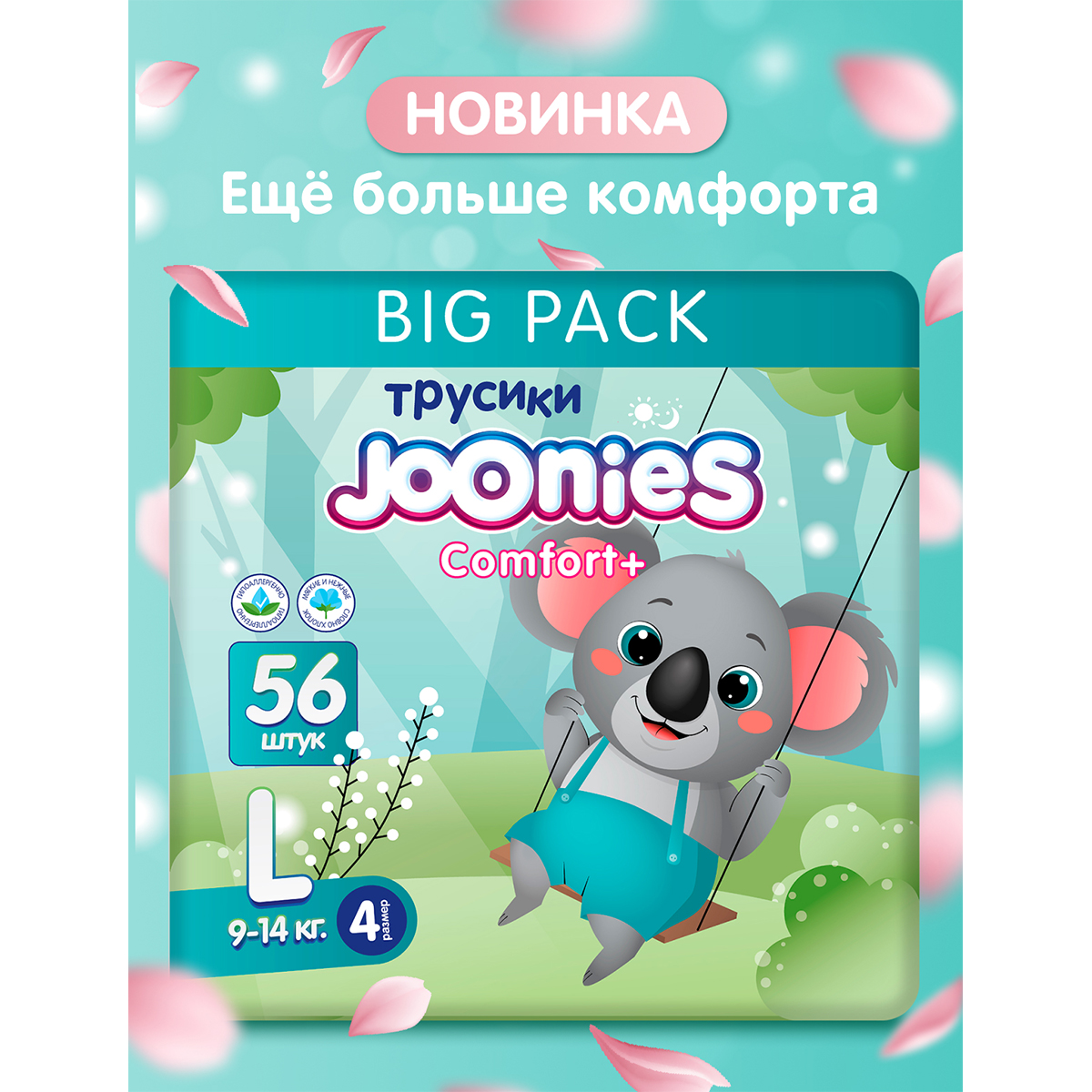 Joonies: Подгузники-трусики BIG Pack Premium Soft, размер L (9-14 кг), 56 штПодгузники-трусики детские одноразовые в новом оформлении. Новые яркие персонажи в каждой пачке. Всё те же дышащие материалы, всё та же мягкость и тонкость. И еще больше абсорбента для еще большего впитывания. - Впитывающий слой подгузников-трусиков TM JOONIES PremiumSoft состоит из премиального современного абсорбента, воздушной целлюлозы и воздушного нетканого материала, благодаря чему абсорбирующий слой не раздувается и не комкается. Сколько бы ребенок ни прыгал, внутренний слой подгузников-трусиков TM JOONIES Premium Soft останется на месте. - Равномерное впитывание по всей поверхности внутреннего слоя дарит малышу чувство комфорта в подгузниках-трусиках TM Joonies до 12 часов.… 9 890 тг.Marwin.kzДоставка: из АлматыПожаловатьсяКупить!