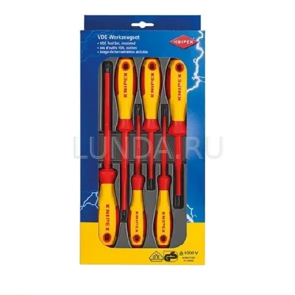 Набор отвёрток VDE 6 Предметов , KNIPEX100 000Купить!тг. Маркетплейс: Satu.kz КлимаТехника Доставка: по Казахстану ПожаловатьсяИнструменты в блоке из пластика глубокой штамповки с прозрачной крышкой Привлекательная упаковка для системы самообслуживания,с отверстием под крючок размеры (Ш х В х Г): 170 x 370 x 40 мм Инструменты еще→, проверенные по нормам VDE стандарт EN/IEC 60900 1000V АртикулКод производителяЦена сайтас НДС,руб/штю3917*KN-002012V058 294,40