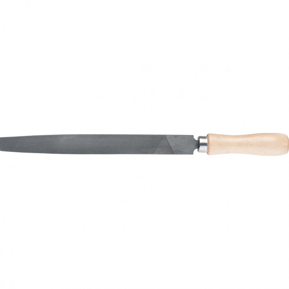 Напильник предназначен для качественной обработки плоских поверхностей твердых материалов. Инструмент имеет двойную перекрестную насечку №2. Ширина плоской части напильника уменьшается от середины к носу. Напильник изготовлен из углеродистой стали. Поставляется в комплекте с деревянной рукояткой, покрытой бесцветным лаком, который защищает древесину от рассыхания и набухания.
