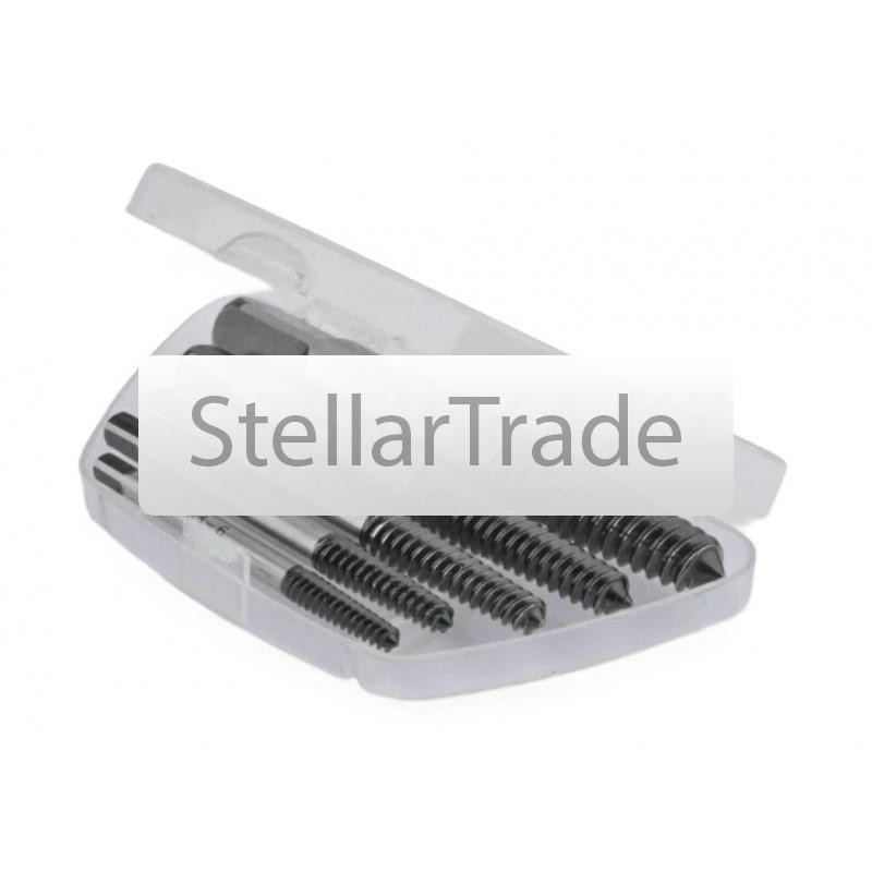 Набор экстракторов GSR 902040Экстракторы служат для выкручивания повреждённых болтов. Для начала в центре болта сверлится отверстие. Затем в высверленное отверстие против часовой стрелки вкручивается экстрактор. Использовать экстрактор можно либо при помощи воротка либо при помощи цангового ключа без трещётки. Материал изготовления: инструментальная сталь. Подходит для: M 3 - М50, W 1/8 - 1.3/4, Nr. 1-8 16 320 тг.Stellartrade.kzДоставка: из АлматыПожаловатьсяКупить!