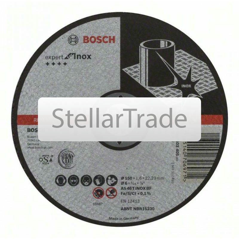 Отрезной круг прямой Bosch 2608603405880Купить!тг.Stellartrade.kzДоставка: из АлматыПожаловатьсяОтрезной круг, прямой, Bosch Expert for Inox AS 46 T INOX BF, 150 mm, 1,6 mm; Прямые Отрезные круги по нержавеющей стали для высоких требований Для ручных угловых шлифмашин еще→Максимальная окружная скорость: 80 м/с (в зависимости от частоты вращения и диаметра круга) Fe/S/Cl Отрезной круг, прямой, Bosch Expert for Inox AS 46 T INOX BF, 150 mm, 1,6 mm 2608603405 Спецификация AS 46 T INOX BF