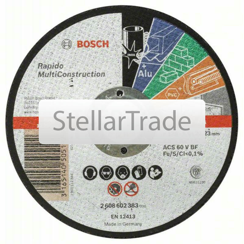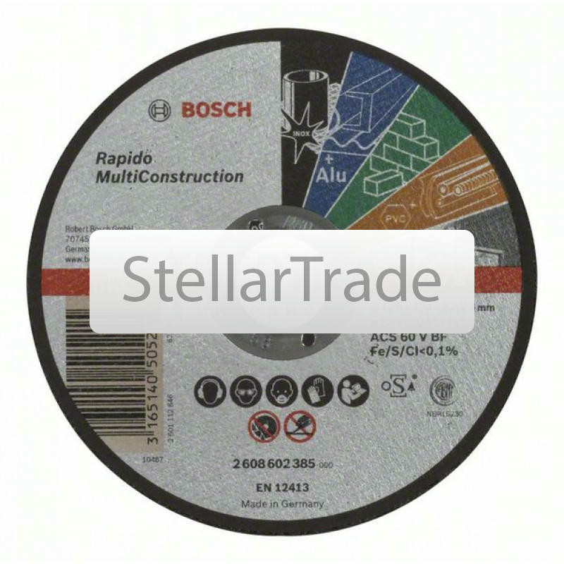 Отрезной круг прямой Bosch 2608602385990Купить!тг.Stellartrade.kzДоставка: из АлматыПожаловатьсяОтрезной круг, прямой, Bosch Rapido Bosch Multi Construction ACS 60 V BF, 125 mm, 1,0 mm; Прямые; Режут практически все без замены круга; Отрезной круг для металла, нержавеющей стали, цветных металлов еще→, камня, мягкой керамической плитки, мрамора и пластмасс Для ручных угловых шлифмашин Максимальная окружная скорость: 80 м/с (в зависимости от частоты вращения и диаметра круга) Fe/S/Cl
