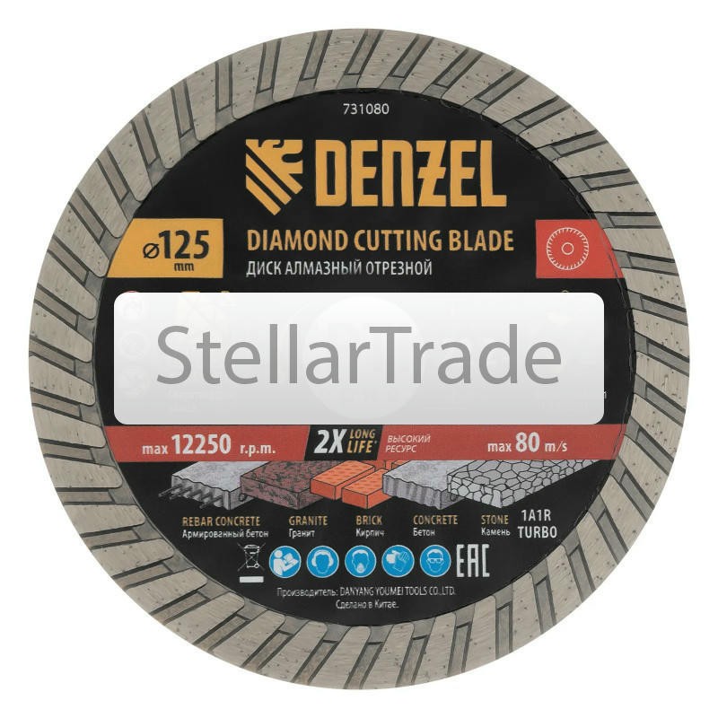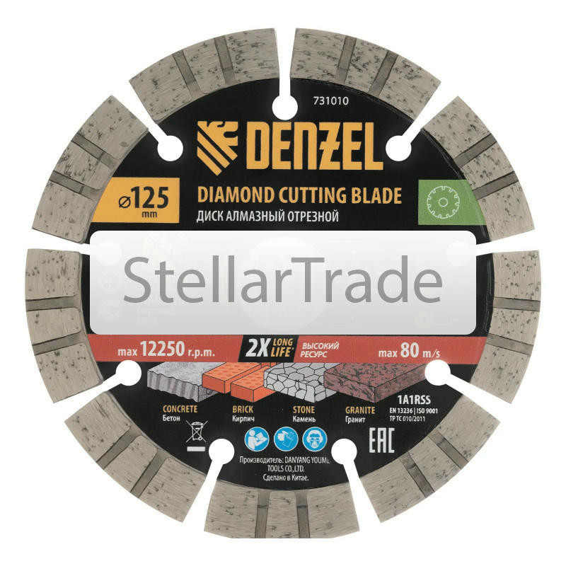 Диск алмазный отрезной Denzel HWD92 7310102 750Купить!тг.Stellartrade.kzДоставка: из АлматыПожаловатьсяАлмазный отрезной диск Denzel 731010 диаметром 125 x 22,2 мм, с сегментной рабочей частью и слоем сверхтвердых алмазов HWD92, предназначен для сухого резания бетона, камня, кирпича, гранита. Используе еще→тся с углошлифовальной машиной (УШМ) или штроборезом, поддерживающими частоту вращения 12250 об/мин. Преимущества Denzel 731010: Надежность - диск изготовлен методом холодного прессования