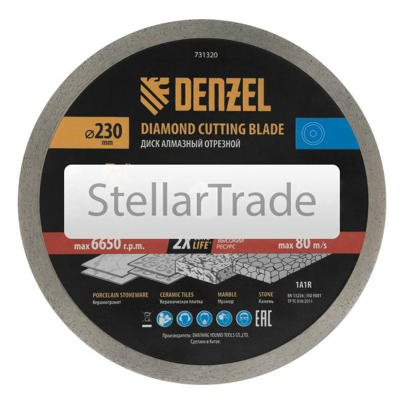 Диск алмазный отрезной Denzel 730559 830Купить!тг.Stellartrade.kzДоставка: из АлматыПожаловатьсяАлмазный диск ТМ Denzel "Сплошной" арт 73055, ф230 х 22,2 мм, предназначен для мокрого резания мрамора, керамогранита и керамическую плитки, камня. Устанавливается на УШМ (болгарку) или плиткорез с по еще→садочным диаметром 22,2 мм. Высокая концентрация алмазов и супертонкая рабочая часть диска обеспечивает идеальную частоту кромок и высокую скорость реза. Диск произведен по технологии горячего