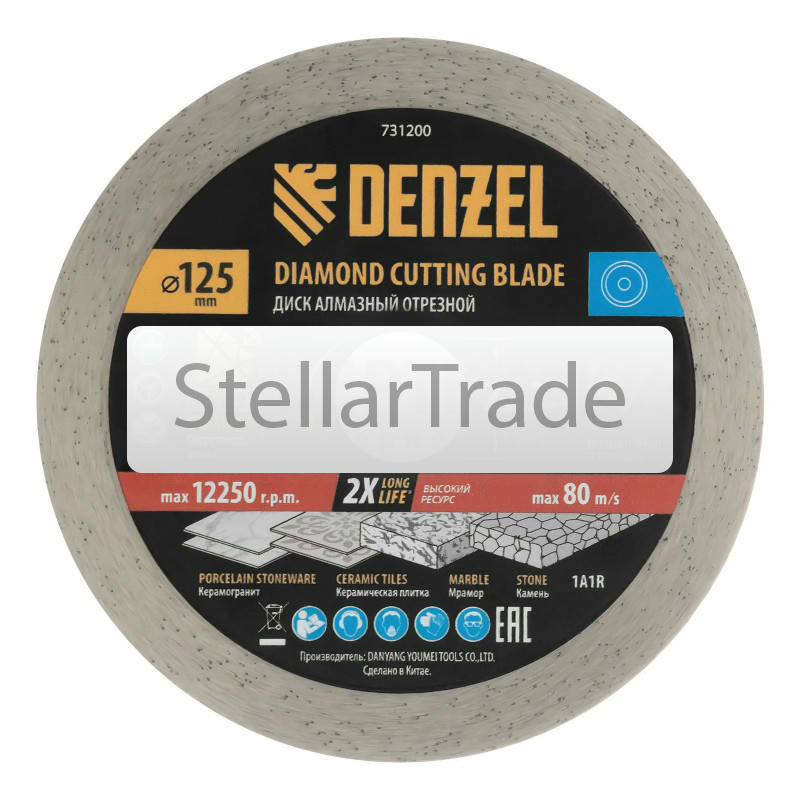 Диск алмазный отрезной Denzel 730455 090Купить!тг.Stellartrade.kzДоставка: из АлматыПожаловатьсяАлмазный диск ТМ Denzel "Сплошной" арт 73045, ф125 х 22,2 мм, предназначен для мокрого резания мрамора, керамогранита и керамическую плитки, камня. Устанавливается на УШМ (болгарку) или плиткорез с по еще→садочным диаметром 22,2 мм. Высокая концентрация алмазов и супертонкая рабочая часть диска обеспечивает идеальную частоту кромок и высокую скорость реза. Диск произведен по технологии горячего
