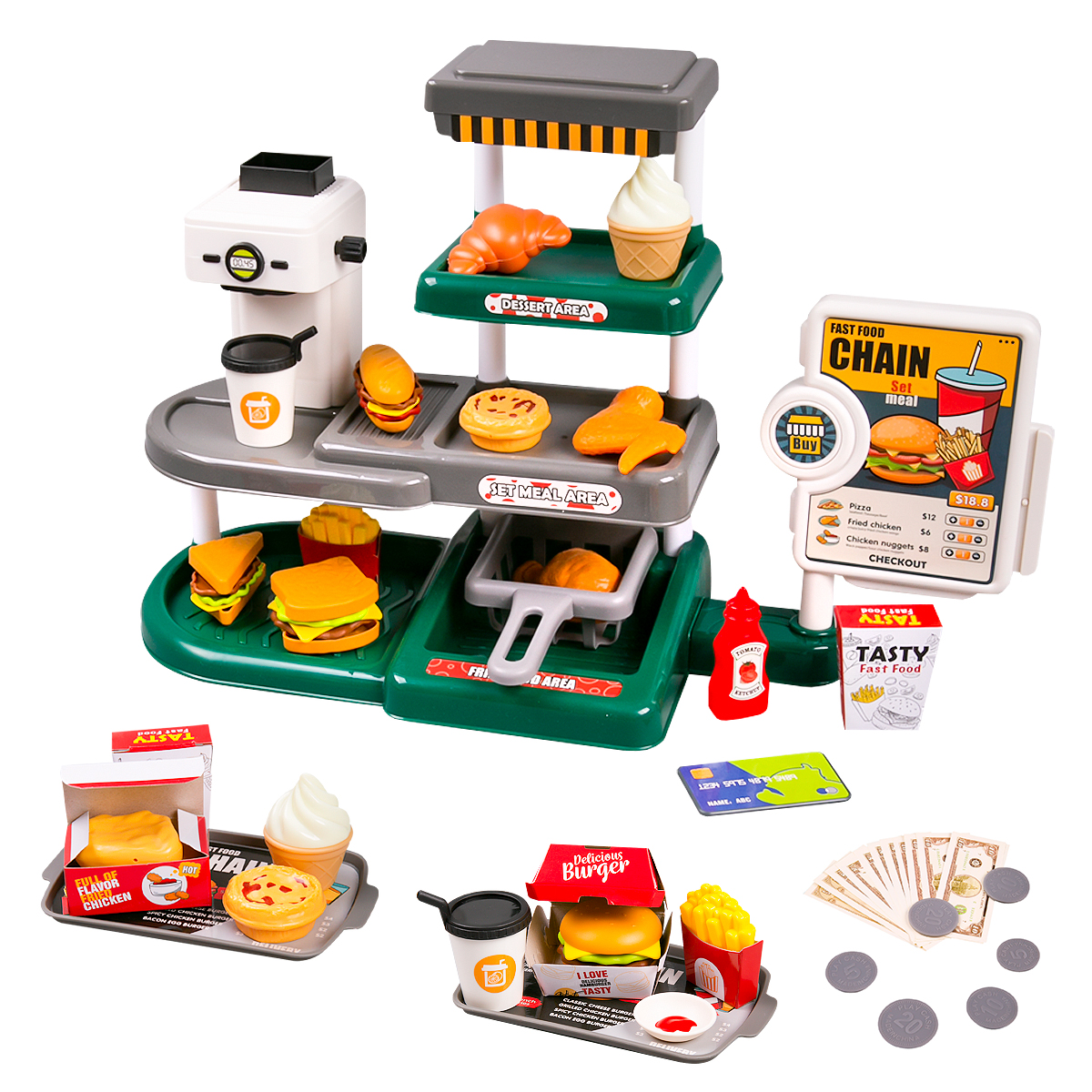 Игровой набор Кафе быстрого питания, 71 предметов5 990Купить!тг.Marwin.kzДоставка: из АлматыПожаловатьсяИнтересный игровой набор, который надолго завладеет вниманием ребенка благодаря своему функционалу. В комплекте есть все необходимое для организации кафе быстрого питания: продукты, прилавок и мно еще→гое другое. Лавка кафе сборная и легко собирается. На полочки можно расположить аксессуары. Все аксессуары выглядят и ощущаются, как настоящие, с яркими цветами и реалистичными текстурами. Функциональная панель с меню издает пикающий звук при проведении банковской картой по дорожке справа, а также при нажатии на кнопку слева с надписью «Buy». Также в наборе имеются сэндвичи и бургер с хот-догом, которые можно собрать. В комплект входят наклейки, с помощью которых можно украсить набор. Набор принесет радость …