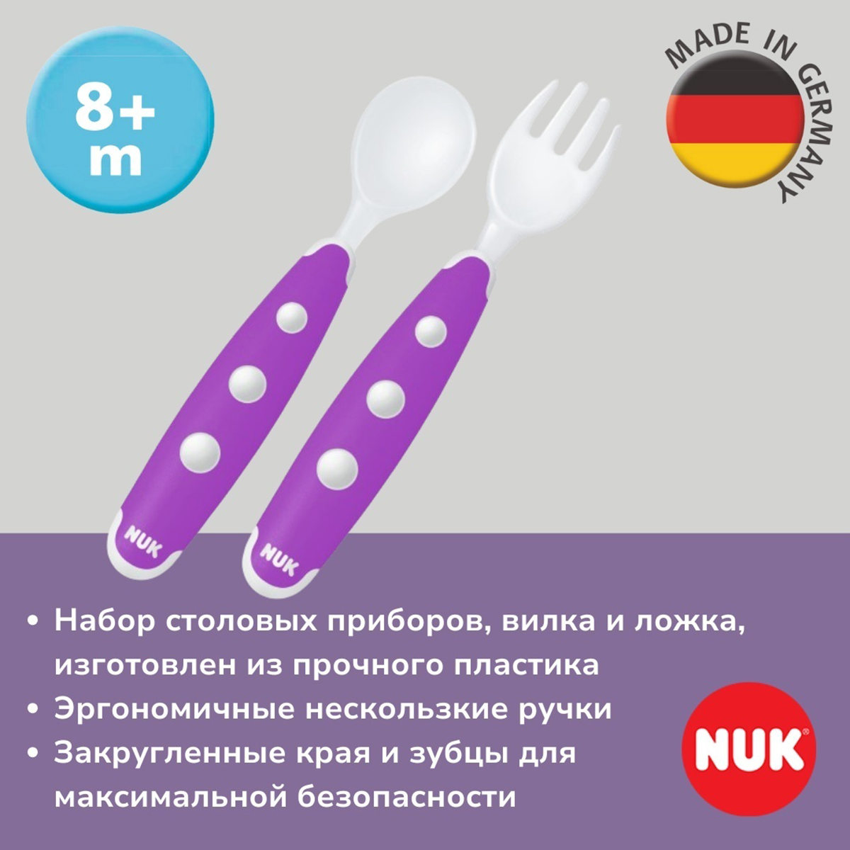 NUK: Ложка и вилка - детские столовые приборы, ассортимент3 080Купить!тг.Marwin.kzДоставка: из АлматыПожаловатьсяНабор столовых приборов включает вилку и ложку из прочного пластика. Подходит для мытья в посудомоечной машине. Компактный размер и закруглённые края разработаны с учётом потребностей детей. Зубцы еще→на вилке помогают легко захватывать пищу. Идеален для самостоятельного использования малышом. Способствует развитию навыков питания. Столовые приборы NUK EASY LEARNING Mini рекомендованы для детей от 8 месяцев. Отлично сочетаются с другими продуктами из линейки NUK EASY LEARNING. - Комплектация: Вилка и ложка - Материал: пластик - Мытье в посудомоечной машине: Да Внимание! Цвет/дизайн товара варьируется. Просьба указывать нужный вариант или товар будет отгружен по наличию на…