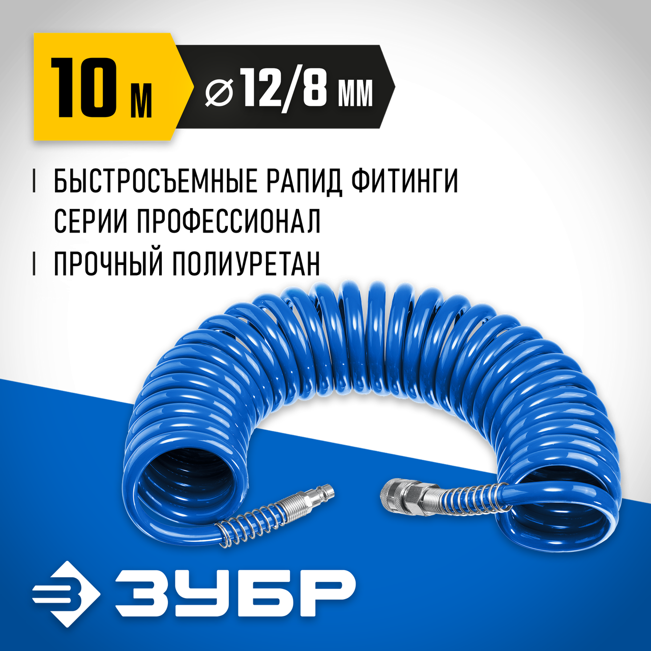 Воздушный спиральный шланг с фитингами рапид, ЗУБР 10 м, 8 х 12 мм, 15 бар, серия "Профессионал" (6472-10) 6472-1012 720Купить!тг.Seeozone.kzДоставка: из АлматыПожаловаться