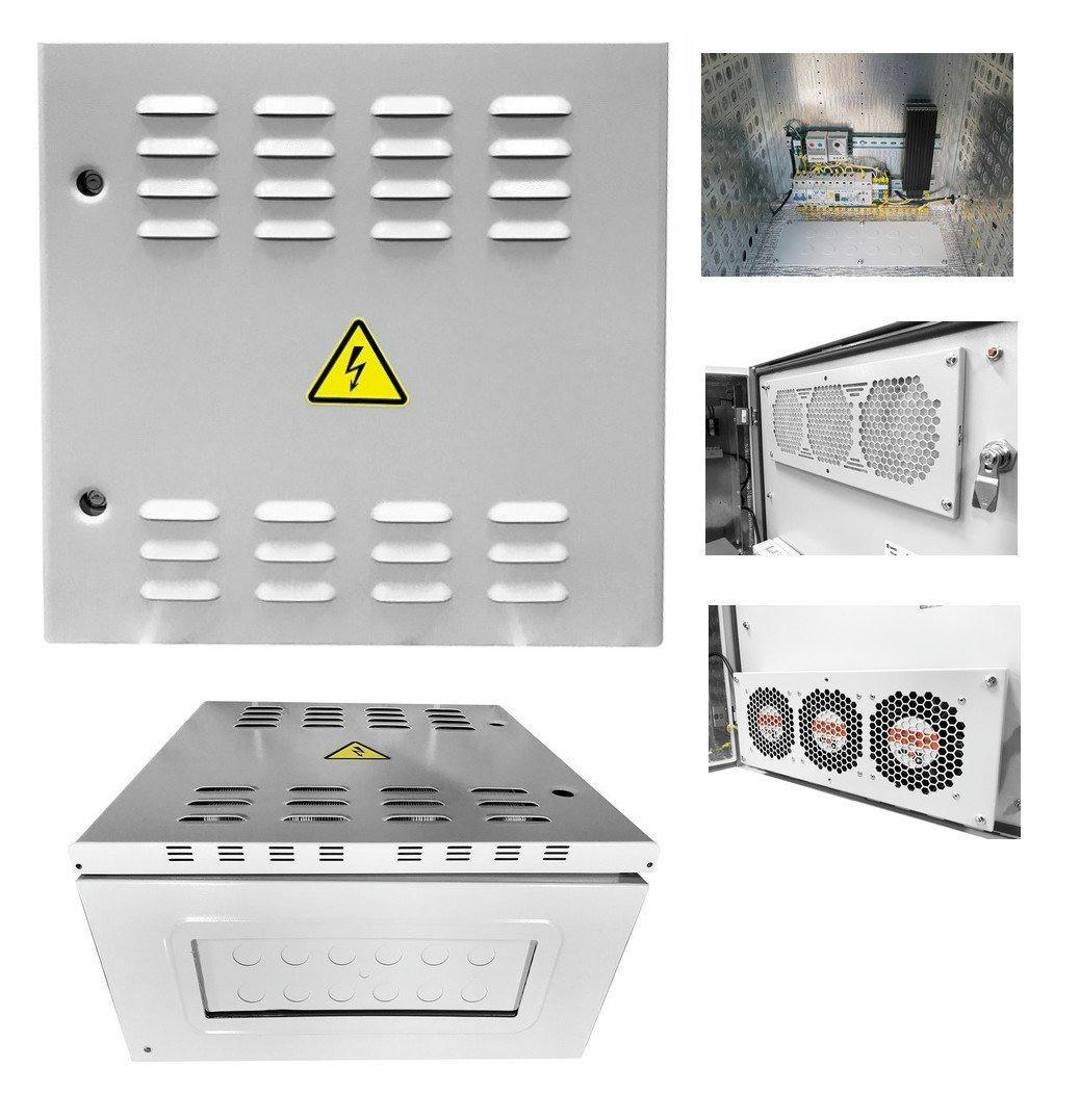 Оптовые поставки! Минимальная сумма заказа — 500 000 T Шкаф уличный всепогодный настенный с системой контроля микроклимата 12U, 600х620х330 мм, полезная глубина 220, металл, передняя дверь вентилируемая, нагрузка до 150 кг, IP54, -50…+45°С. В комплект входит: вентилятор, нагреватель, разрядник, индикатор напряжения, гигростат, термостат, УЗО, автомат, розетка 16А, клеммник, шина заземления, геркон, DIN рейка, монтажная панель, вертикальн. напр 19".,