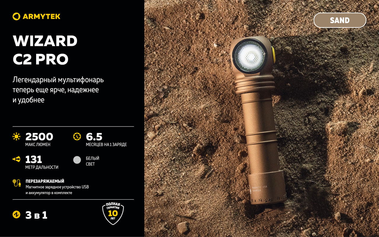 ARMYTEK WIZARD C2 PRO SAND (холодный свет)Wizard C2 Pro — идеальное решение для тех, кто ищет мощный многофункциональный фонарь для продолжительного профессионального и ежедневного использования. Модель отличается невероятной яркостью до 2500 люмен и дальностью света до 131 метра. Заряжается от любого USB-источника питания с помощью магнитного USB-кабеля. Мощный магнит в задней крышке позволяет закрепить фонарь на любой 55 100 тг. Маркетплейс: Satu.kz ТОО "THOR'S HAMMER" Доставка: по Казахстану ПожаловатьсяКупить!