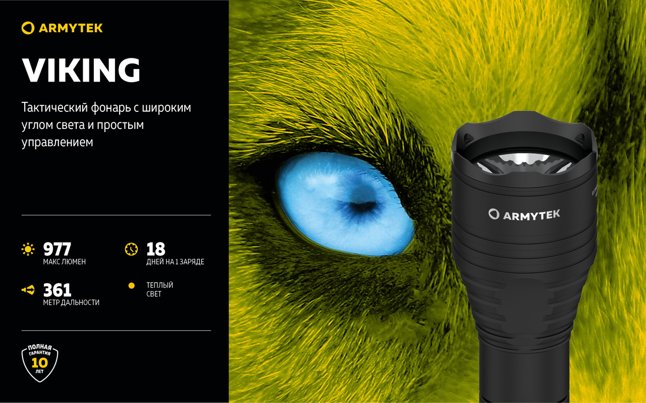ARMYTEK VIKING (теплый свет)Тактический фонарь VIKING — это: Изумительная яркость 977 OTF люмен Невероятно дальнобойный свет до 353 метров Удобный свет 5/40º для продуктивной охоты из гладкоствольного оружия Постоянная яркость света даже при -25ºC и при почти разряженном аккумуляторе Стандарт пыле- и водонепроницаемости IP68 – фонарь работает более 5 часов на глубине до 25 метров Благодаря стандартному 1" (один дюйм) 37 100 тг. Маркетплейс: Satu.kz ТОО "THOR'S HAMMER" Доставка: по Казахстану ПожаловатьсяКупить!