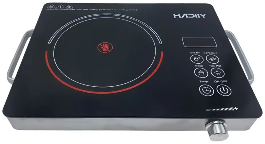 Электроплита HADIIY 7031-HD — компактная настольная модель в чёрном корпусе со стеклокерамической поверхностью. Оснащена двумя конфорками, которые быстро нагреваются и обеспечивают равномерное приготовление пищи. Управление осуществляется удобными поворотными регуляторами, позволяющими легко выбрать оптимальный уровень мощности. Благодаря современному дизайну плита гармонично впишется в любую кухню, а гладкая стеклокерамическая поверхность упрощает уход и очистку. Модель отлично подойдёт для дома, дачи или офиса, где требуется функциональное и удобное решение для приготовления еды.