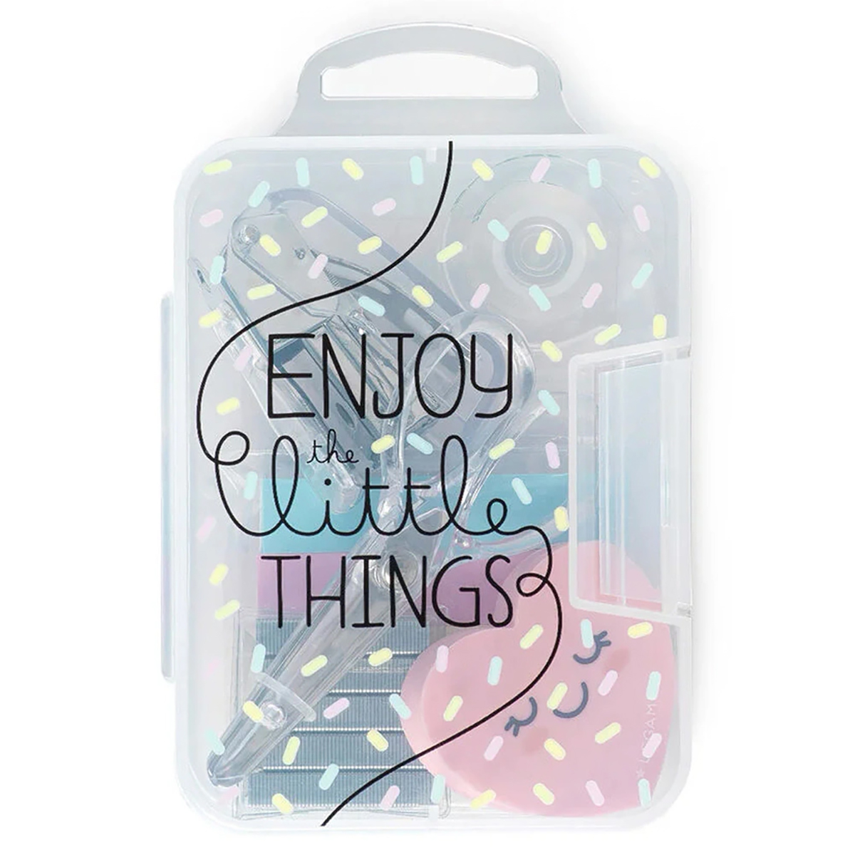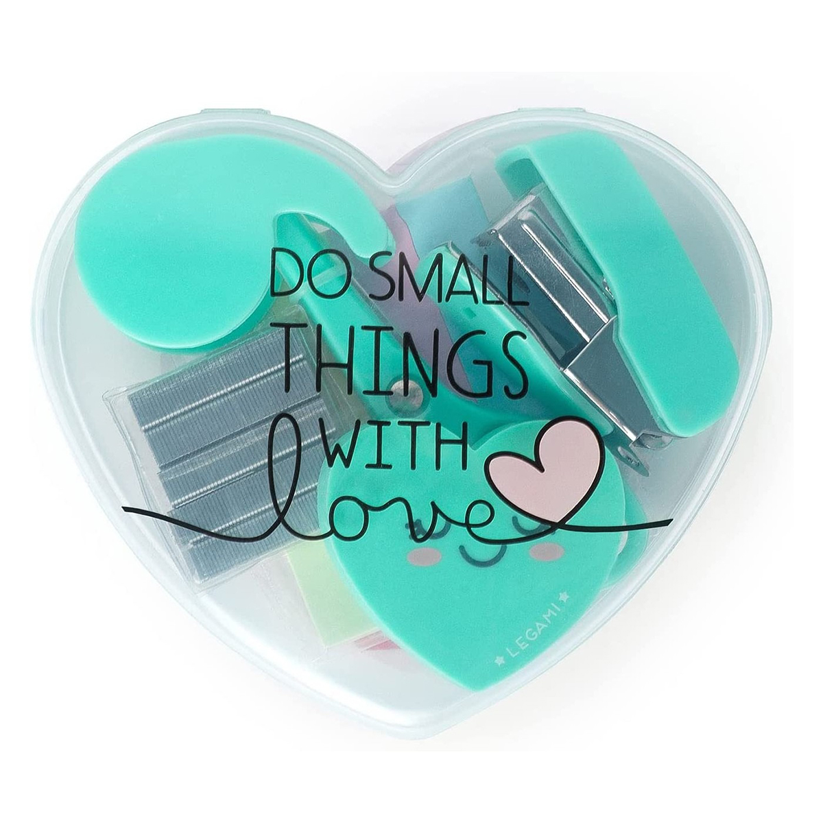 | Наслаждайтесь мелочами с мини-набором канцелярских принадлежностей Legami. В прозрачной коробке находятся 6 мини-аксессуаров, которые вы можете брать с собой куда угодно — от дома до библиотеки, от школы до работы: ножницы, маркер-фломастер, закладки для страниц, клейкая лента с дозатором, степлер и скобы. Этот набор предлагает практичные канцелярские принадлежности, которые вам понадобятся во всех сферах жизни, в одном комплекте. | |