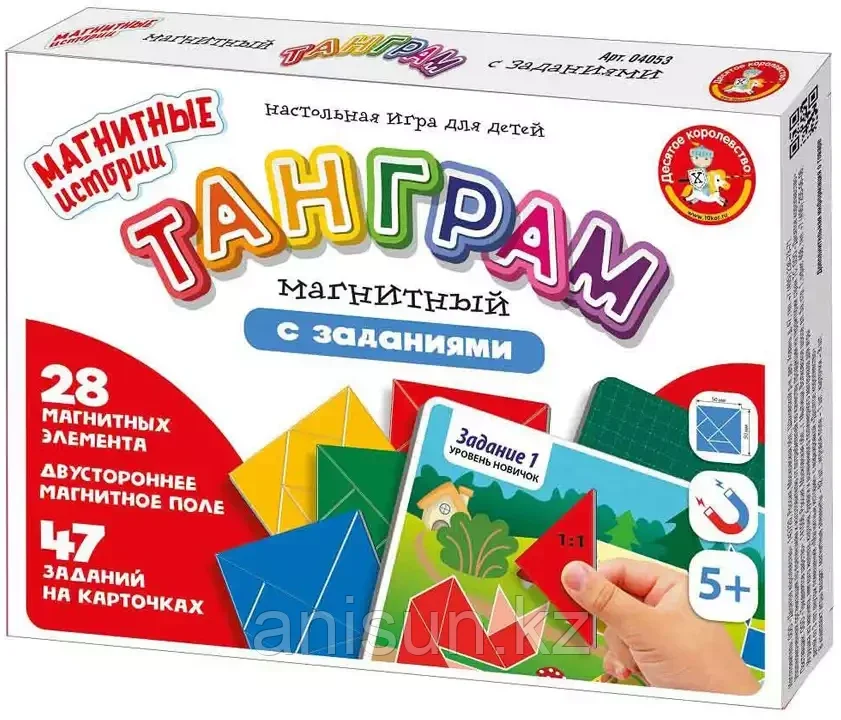 Магнитные истории Танграм с заданиями 04053 Десятое Королевство1 833Купить!тг. Маркетплейс: Satu.kz ID Shopps.kz - Оптово-розничный Склад Доставка: по Казахстану ПожаловатьсяМагнитный танграм с заданиями – игра на логику. Состав игры: двухстороннее магнитное игровое поле (23,5 х 14,7 см), разноцветные магнитные блоки с деталями (5 х 5 см) – 4 шт., всего 28 деталей (цвета: еще→жёлтый, синий, красный и зелёный), карточки с заданиями – 8 шт., всего 47 заданий (22,5 х 3,7 см). Материалы: магнитомягкое железо, картон, магнит, бумага. ID Shopp.kz лучший партнер по бизнесу c Китаем, Южной