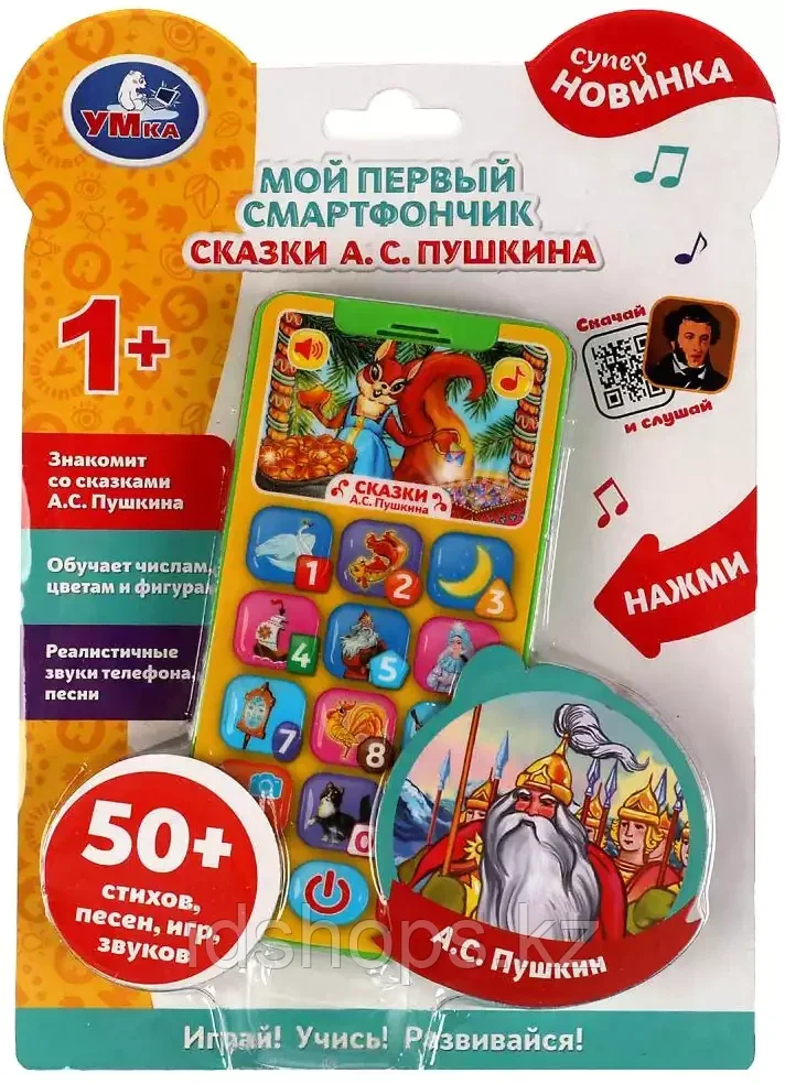 Игрушка музыкальная HT830-R19 Телефон обучающий Сказки А.С.Пушкина2 106Купить!тг. Маркетплейс: Satu.kz ID Shopps.kz - Оптово-розничный Склад Доставка: по Казахстану ПожаловатьсяОбучающий смартфончик «Сказки А. С. Пушкина» ТМ «УМка» непременно понравится малышу:- 50+ стихов, песен, игр, звуков- знакомит со сказками Пушкина- обучает числам, цветам и фигурам- реалистичные звуки еще→телефона- кнопка «Вкл./Выкл.»Яркий телефон сделает обучение малыша лёгким и интересным. Он с удовольствием будет нажимать на разноцветные кнопочки и слушать песни, стихи и, конечно,