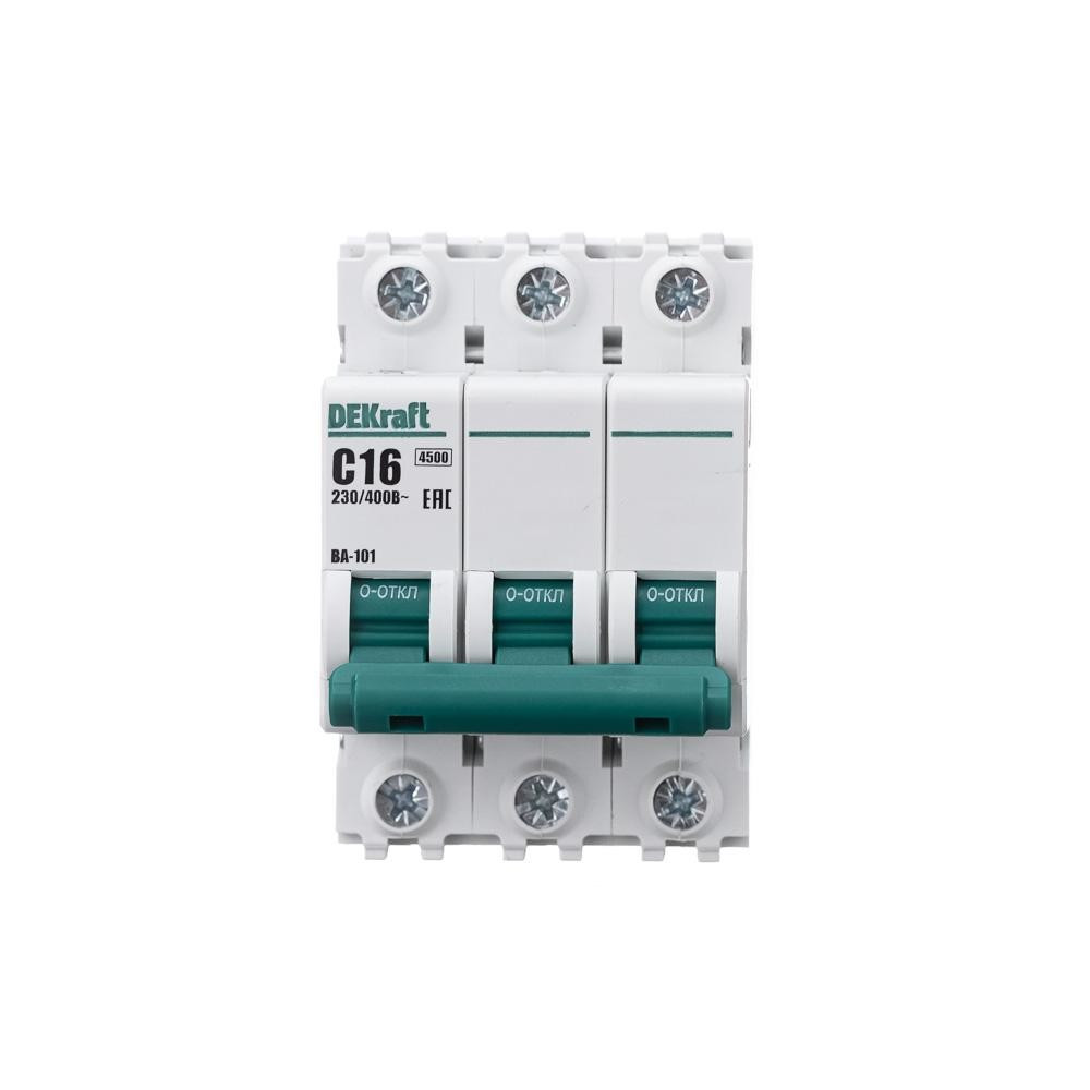Автоматический выключатель DEKraft 3Р C 10A 4,5кА 11077DEK ВА1012 000Купить!тг. Маркетплейс: Satu.kz ИП Нуркенов Ж.А. Доставка: по Казахстану ПожаловатьсяНоминальный ток - 10 Автоматический выключатель DEKraft 11078DEK ВА101 3Р C 16A 4,5кА Автоматический выключатель серии ВА-101 DEKraft; 3P; номинальный ток 16 А; характеристика С; отключающая способнос еще→ть 4,5 кА. Новый механизм расцепления мгновенно разрывает цепь при возникновении аварии. 5 монолитных заклепок повышают прочность корпуса аппарата. Сплошная лицевая панель обеспечивает безопасность эксплуатации аппарата. Боковые каналы охлаждения повышают стабильность работы при высоких температурах окружающей среды. Полностью автоматизированный контроль качества производства.