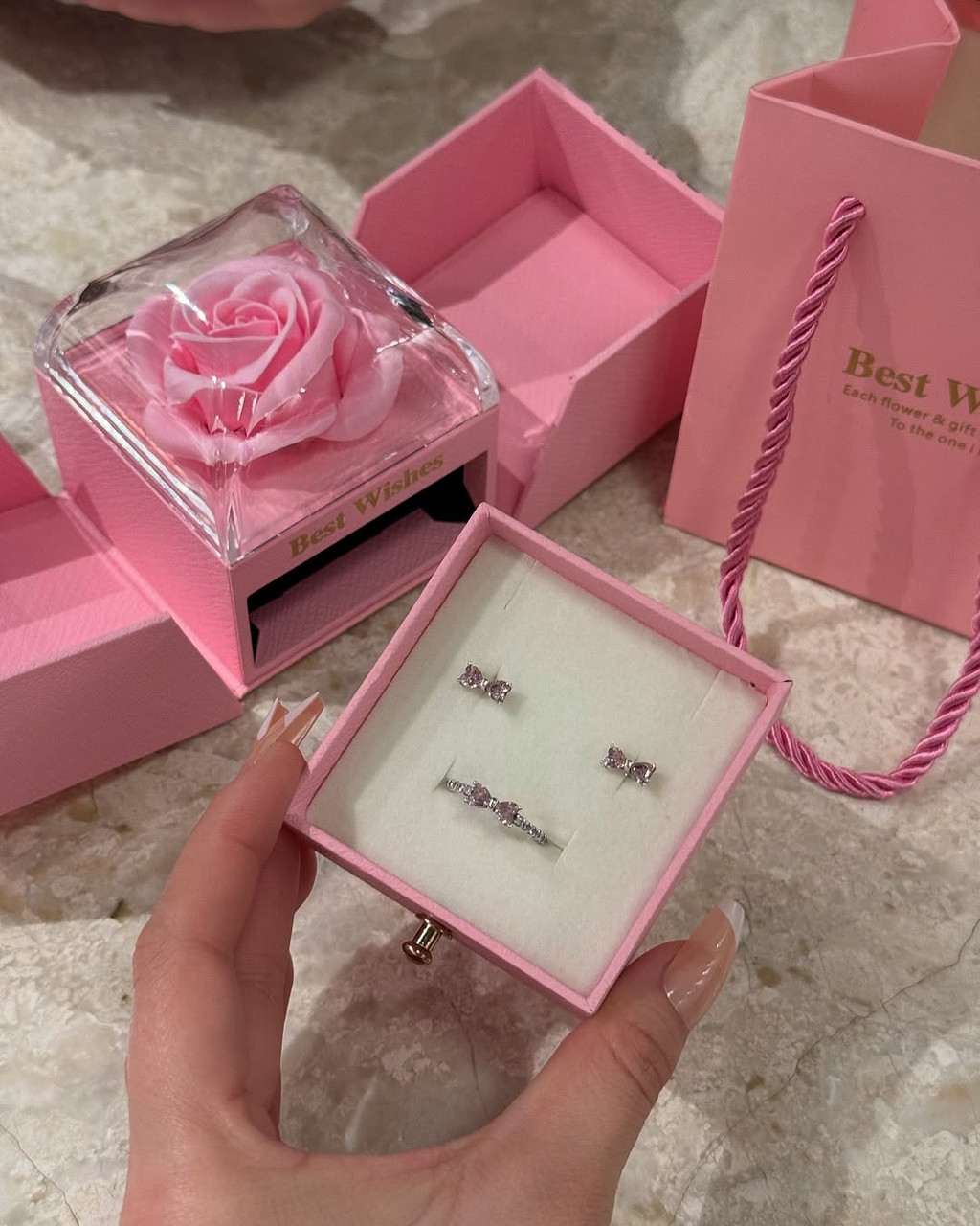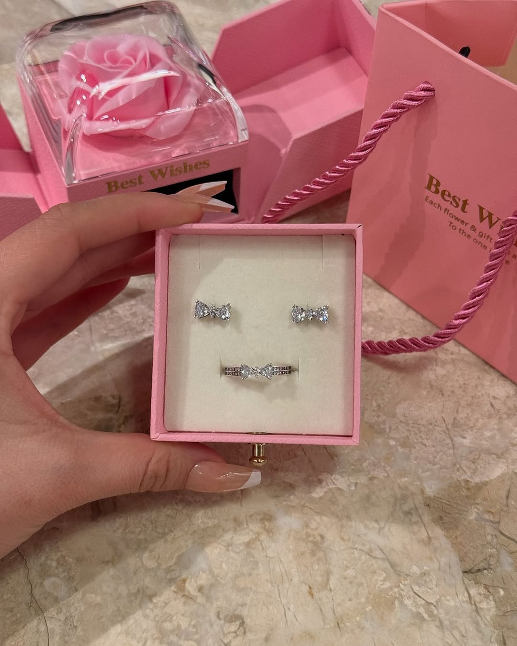 Комплект ювелирных украшений серебро цирконий розовый оформление в подарок Белый18 500Купить!тг. Маркетплейс: Satu.kz Raz i navsegda Доставка: по Казахстану ПожаловатьсяЭтот элегантный комплект включает в себя серьги и кольцо, украшенные миниатюрными бантиками. Дизайн изящный и утонченный, что делает украшения подходящими как для повседневного образа, так и для особы еще→х случаев. Оформление комплекта подчеркивает его изысканность. Украшения помещены в изящную коробочку, которая гармонирует с общей концепцией подарочного набора. В комплект также входит стильный подарочный пакет и декоративный бокс с искусственной розой, добавляющий нотку романтики. Такой набор станет прекрасным подарком, передающим тепло и нежность.